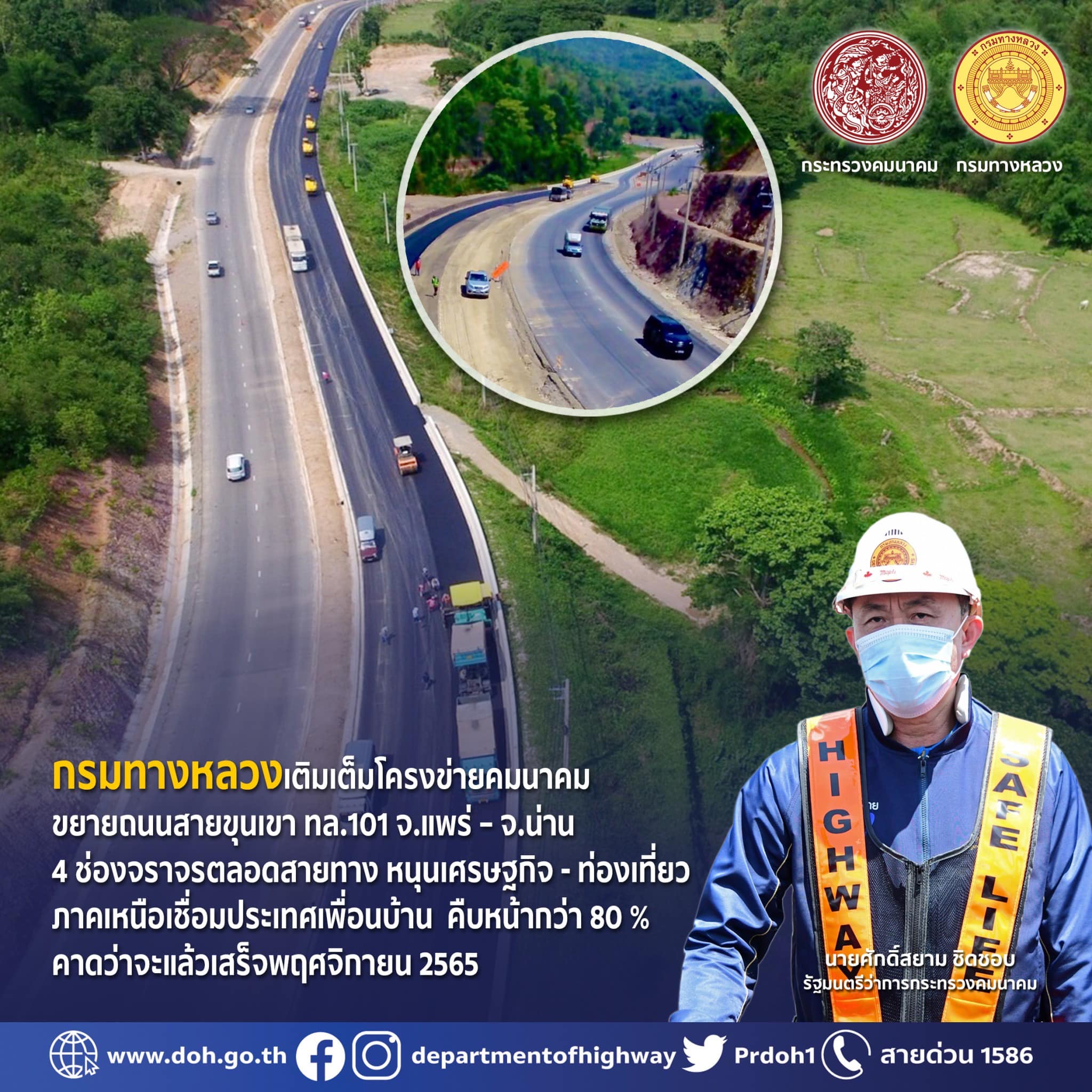 กรมทางหลวงเติมเต็มโครงข่ายคมนาคมขยายถนนสายขุนเขา ทล.101 จ.แพร่ – จ.น่าน 4 ช่องจราจรตลอดสายทาง หนุนเศรษฐกิจ-ท่องเที่ยวภาคเหนือเชื่อมประเทศเพื่อนบ้าน คืบหน้ากว่า 80 % คาดแล้วเสร็จพฤศจิกายน 2565