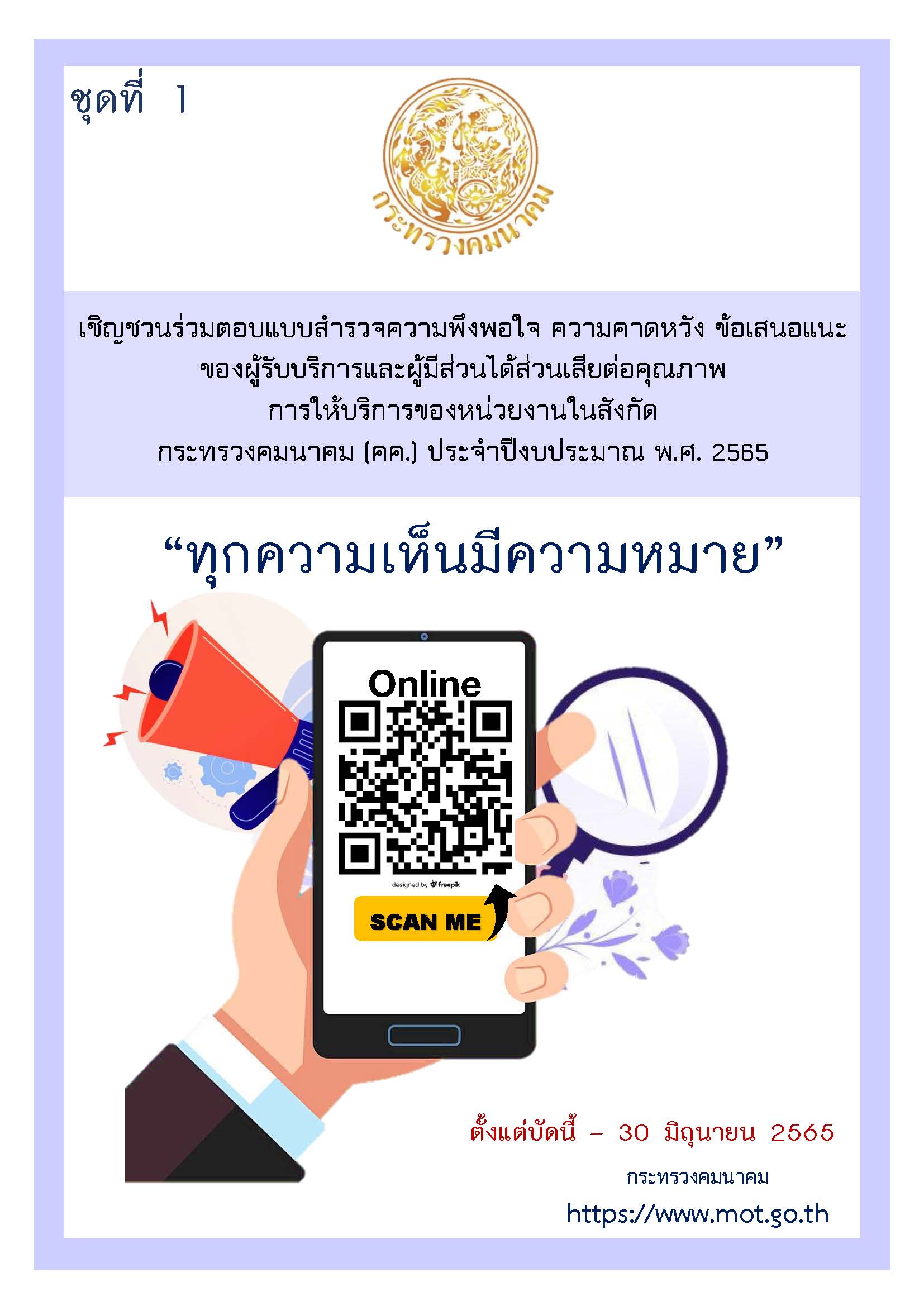 เชิญชวนร่วมตอบแบบส ํารวจควํามพึงพอใจควํามคําดหวัง ข้อเสนอแนะของผู้รับบริกํารและผู้มีส่วนได้ส่วนเสียต่อคุณภําพกํารให้บริกํารของหน่วยงํานในสังกัดกระทรวงคมนําคม(คค.)ประจ ําปีงบประมําณ พ.ศ. 2565