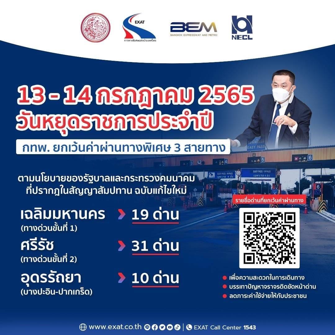 การทางพิเศษแห่งประเทศไทย ยกเว้นการเก็บค่าผ่านทางพิเศษ 3 สายทาง ในวันหยุดราชการประจำปี ระหว่างวันที่ 13 - 14 กรกฎาคม 2565