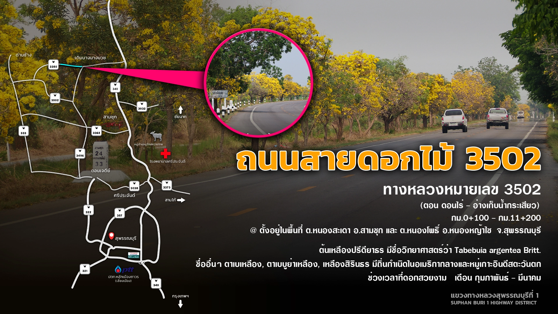 กรมทางหลวงชวนชมความงาม “ถนนสายดอกเหลืองปรีดียาธร” จ.สุพรรณบุรี วอนไม่จอดรถกีดขวางการจราจร
