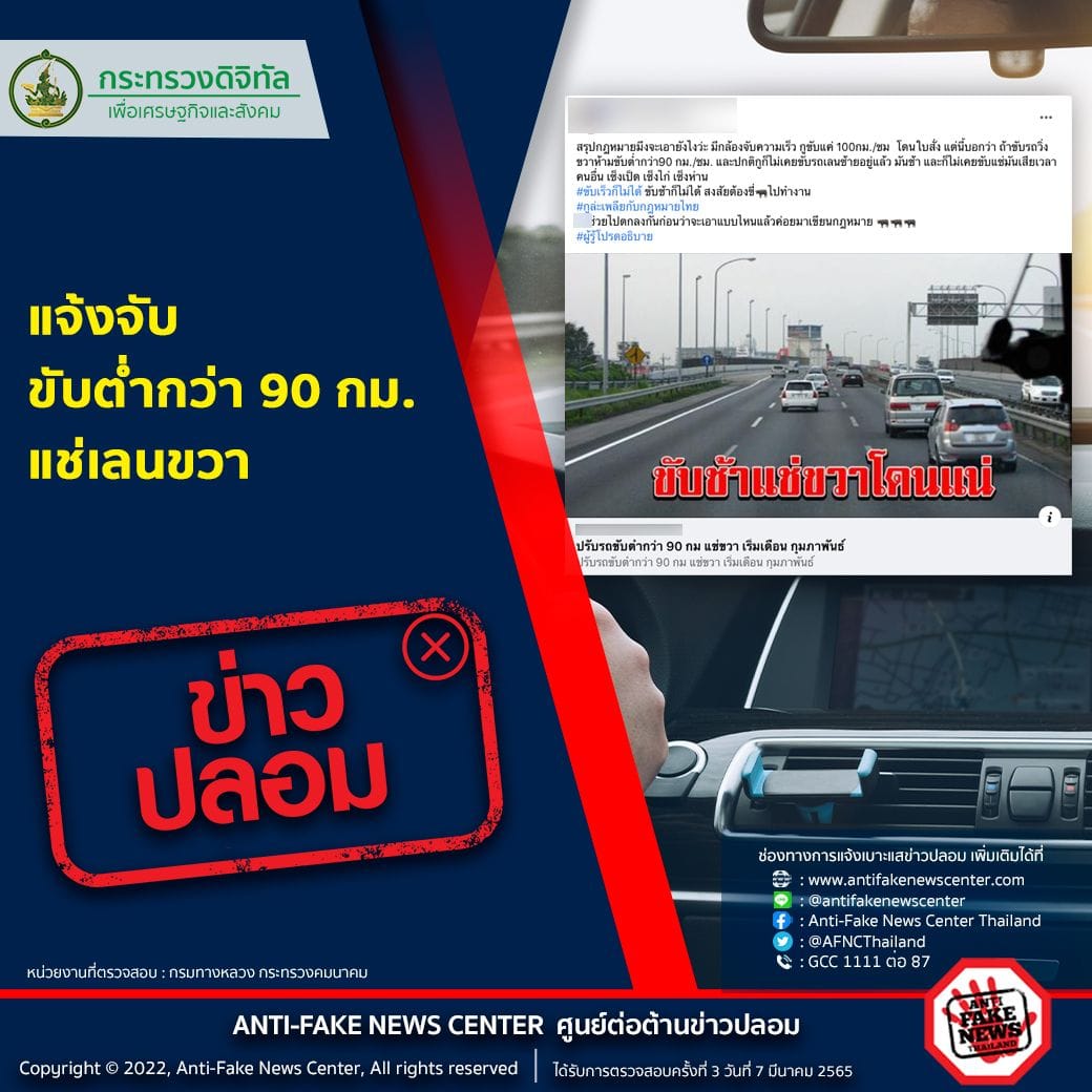 ข่าวปลอม อย่าแชร์! แจ้งจับ ขับต่ำกว่า 90 กม. แช่เลนขวา