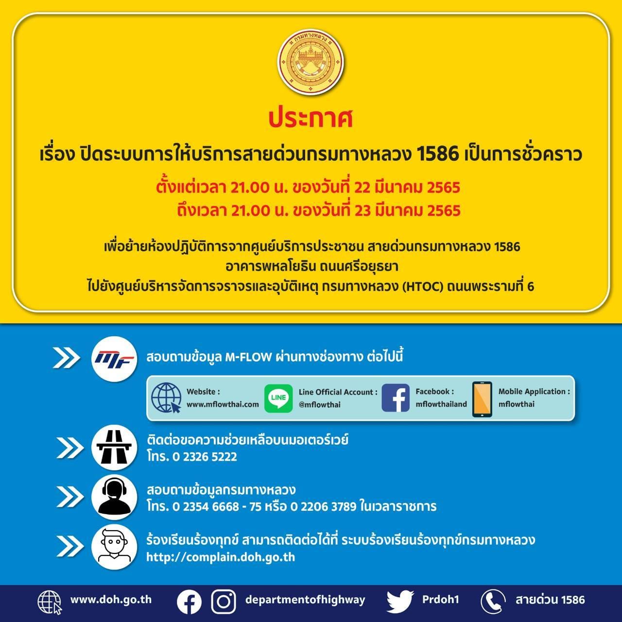 กรมทางหลวงแจ้งปิดให้บริการสายด่วน 1586 ชั่วคราว ตั้งแต่เวลา 21.00 น. ของวันที่ 22 มีนาคม 2565 ถึงเวลา 21.00 น. ของวันที่ 23 มีนาคม 2565