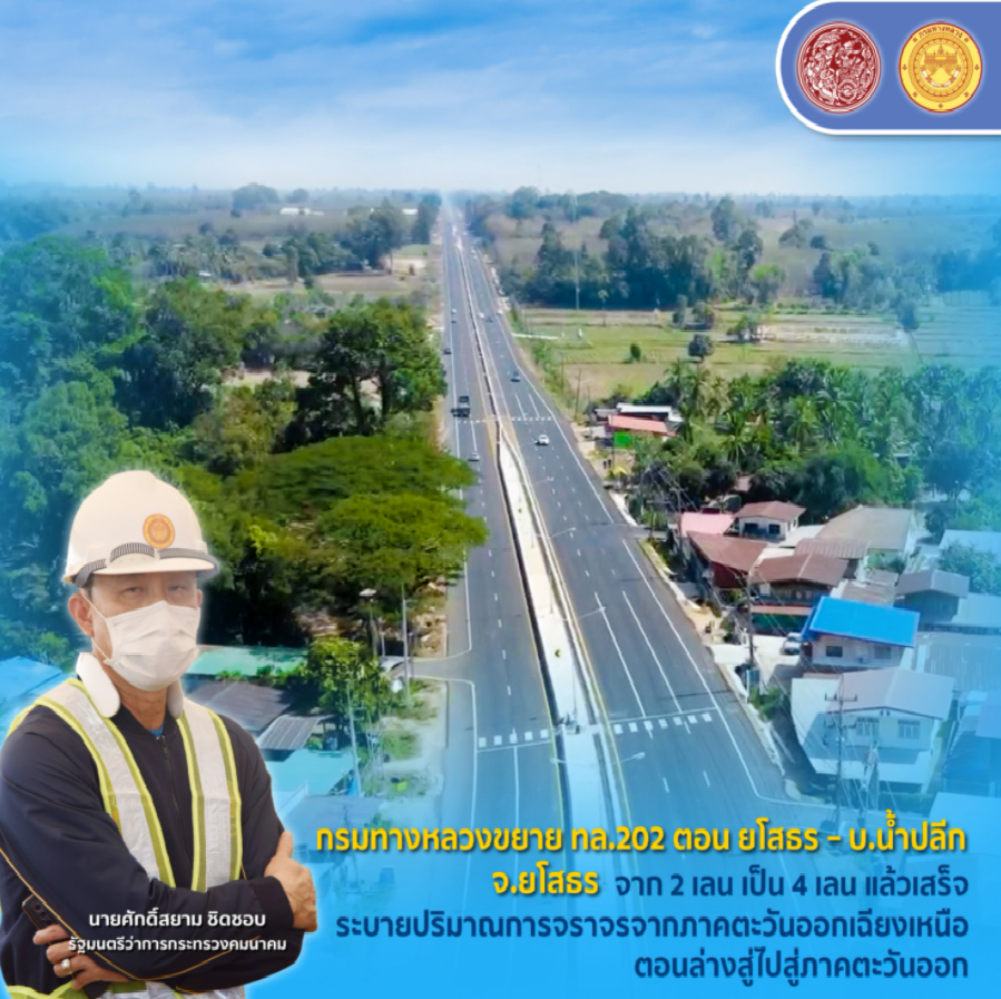 กรมทางหลวงขยาย ทล.202 ตอน ยโสธร – บ.น้ำปลีก จ.ยโสธร เป็น 4 เลน แล้วเสร็จ ระบายปริมาณการจราจรจากภาคตะวันออกเฉียงเหนือตอนล่างสู่ไปสู่ภาคตะวันออก
