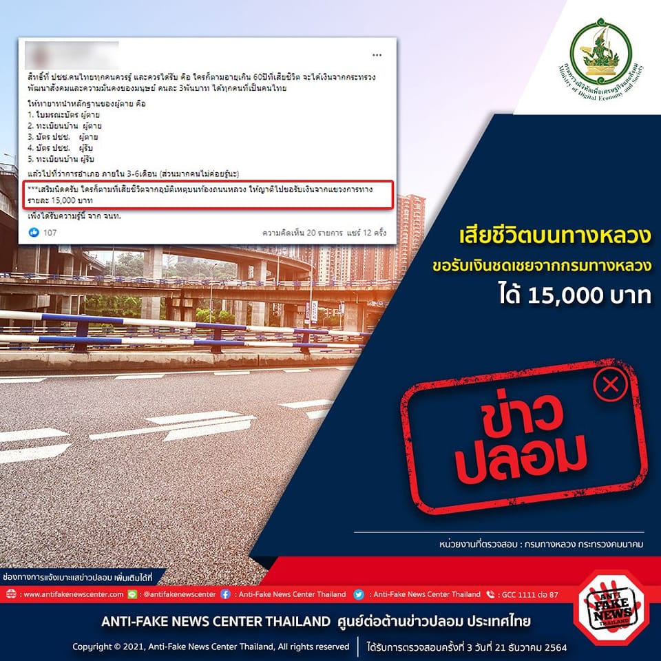 [ข่าวปลอม]เสียชีวิตบนทางหลวง ขอรับเงินชดเชยจากกรมทางหลวงได้ 15,000 บาท