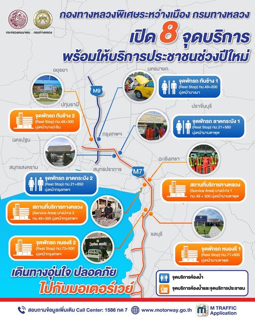 มอเตอร์เวย์เปิด 8 จุดพร้อมให้บริการประชาชนช่วงปีใหม่ #เดินทางอุ่นใจ ปลอดภัยไปกับมอเตอร์เวย์# 1586 กด 7 โทรฟรีทุกเครือข่าย 24 ชั่วโมง