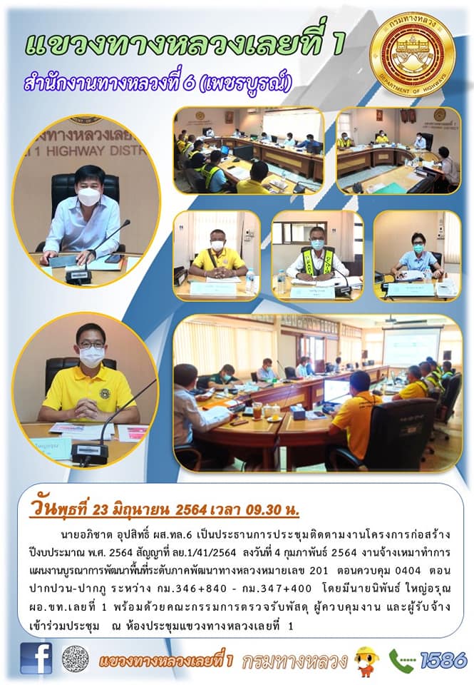 วันพุธที่ 23 มิถุนายน 2564 เวลา 09.30 น. นายอภิชาต อุปสิทธิ์ ผส.ทล.6 เป็นประธานการประชุมติดตามงานโครงการก่อสร้างปีงบประมาณ พ.ศ. 2564 สัญญาที่ ลย.1/41/2564 ลงวันที่ 4 กุมภาพันธ์ 2564 งานจ้างเหมาทำการแผนงานบูรณาการพัฒนาพื้นที่ระดับภาคพัฒนาทางหลวงหมายเลข 201 ตอนควบคุม 0404 ตอน ปากปวน-ปากภู ระหว่าง กม.346+840 - กม.347+400 โดยมีนายนิพันธ์ ใหญ่อรุณ ผอ.ขท.เลยที่ 1 พร้อมด้วยคณะกรรมการตรวจรับพัสดุ ผู้ควบคุมงาน และผู้รับจ้าง เข้าร่วมประชุม ณ ห้องประชุมแขวงทางหลวงเลยที่ 1