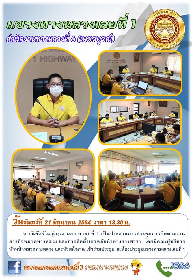 วันจันทร์ที่ 21 มิถุนายน 2564 เวลา 13.30 น. นายนิพันธ์ ใหญ่อรุณ ผอ.ขท.เลยที่ 1 เป็นประธานการประชุมการติดตามงานภารกิจหมวดทางหลวง