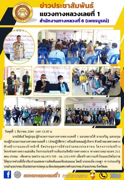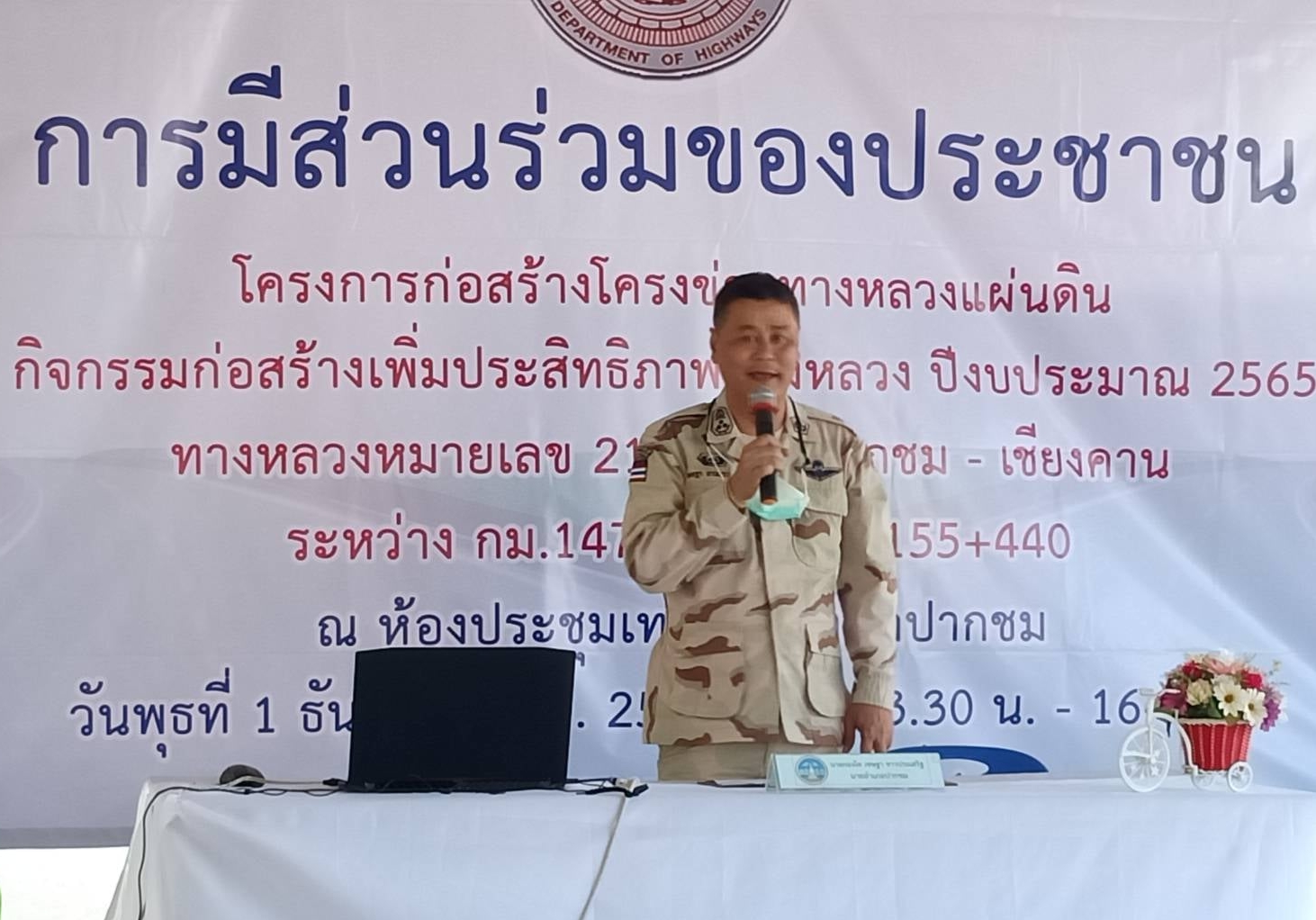 วันพุธที่ 1 ธันวาคม 2564 เวลา 13.30 น. นายนิพันธ์ ใหญ่อรุณ ผู้อำนวยการแขวงทางหลวงเลยที่ 1 มอบหมายให้ นายเจริญ แสงอรุณ รองผู้อำนวยการแขวงทางหลวงเลยที่ 1 ( ฝ่ายปฏิบัติการ ) พร้อมด้วยคณะผู้บริหาร หัวหน้าหมวดทางหลวง หัวหน้างานและเจ้าหน้าที่ จัดประชุมการมีส่วนร่วมของประชาชน โครงการก่อสร้างโครงข่ายทางหลวงแผ่นดิน กิจกรรมก่อสร้างเพิ่มประสิทธิภาพทางหลวง ทางหลวงหมายเลข 211 ตอน ปากชม - เชียงคาน ระหว่าง กม.147+750 - กม.155+440 เพื่อสร้างความเข้าใจและเปิดโอกาสให้ทุกภาคส่วนที่เกี่ยวข้องร่วมแสดงความคิดเห็นและข้อเสนอแนะ โดยมี นายกองโท เชษฐา ขาวประเสริฐ นายอำเภอปากชม เป็นประธานการประชุม ณ ห้องประชุมเทศบาลตำบลปากชม อำเภอปากชม จังหวัดเลย