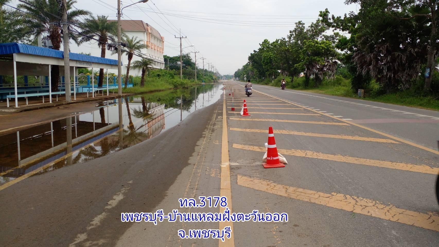 1. ทล.3178 ช่วง เพชรบุรี-บ้านแหลมฝั่งตะวันออก กม.10+700-10+900 ระดับน้ำสูง 10 ซม พื้นที่ อ.บ้านแหลม