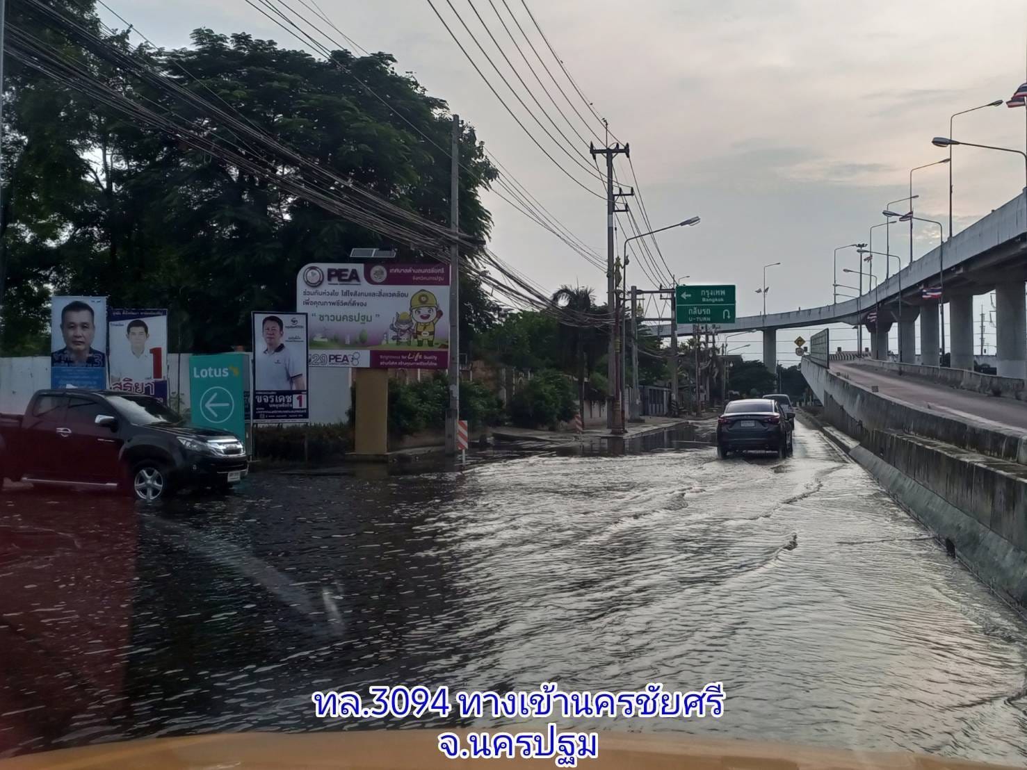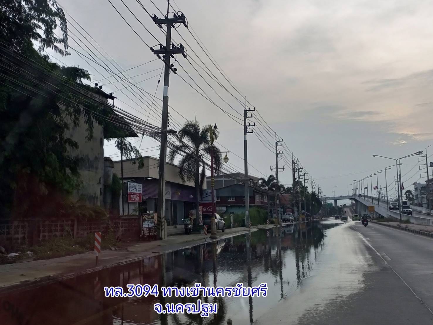 2. ทล. 3094 ช่วง ทางเข้านครชัยศรี กม.0+000-1+894 ขาเข้าและขาออก ระดับน้ำสูง 20 ซม. พื้นที่ อ.นครชัยศรี