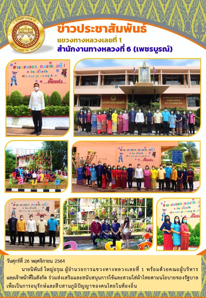 วันศุกร์ที่ 26 พฤศจิกายน 2564 นายนิพันธ์ ใหญ่อรุณ ผู้อำนวยการแขวงทางหลวงเลยที่ 1 พร้อมด้วยคณะผู้บริหาร และเจ้าหน้าที่ในสังกัด ร่วมส่งเสริมและสนับสนุนการใช้และสวมใส่ผ้าไทยตามนโยบายของรัฐบาล เพื่อเป็นการอนุรักษ์และสืบสานภูมิปัญญาของคนไทยในท้องถิ่น