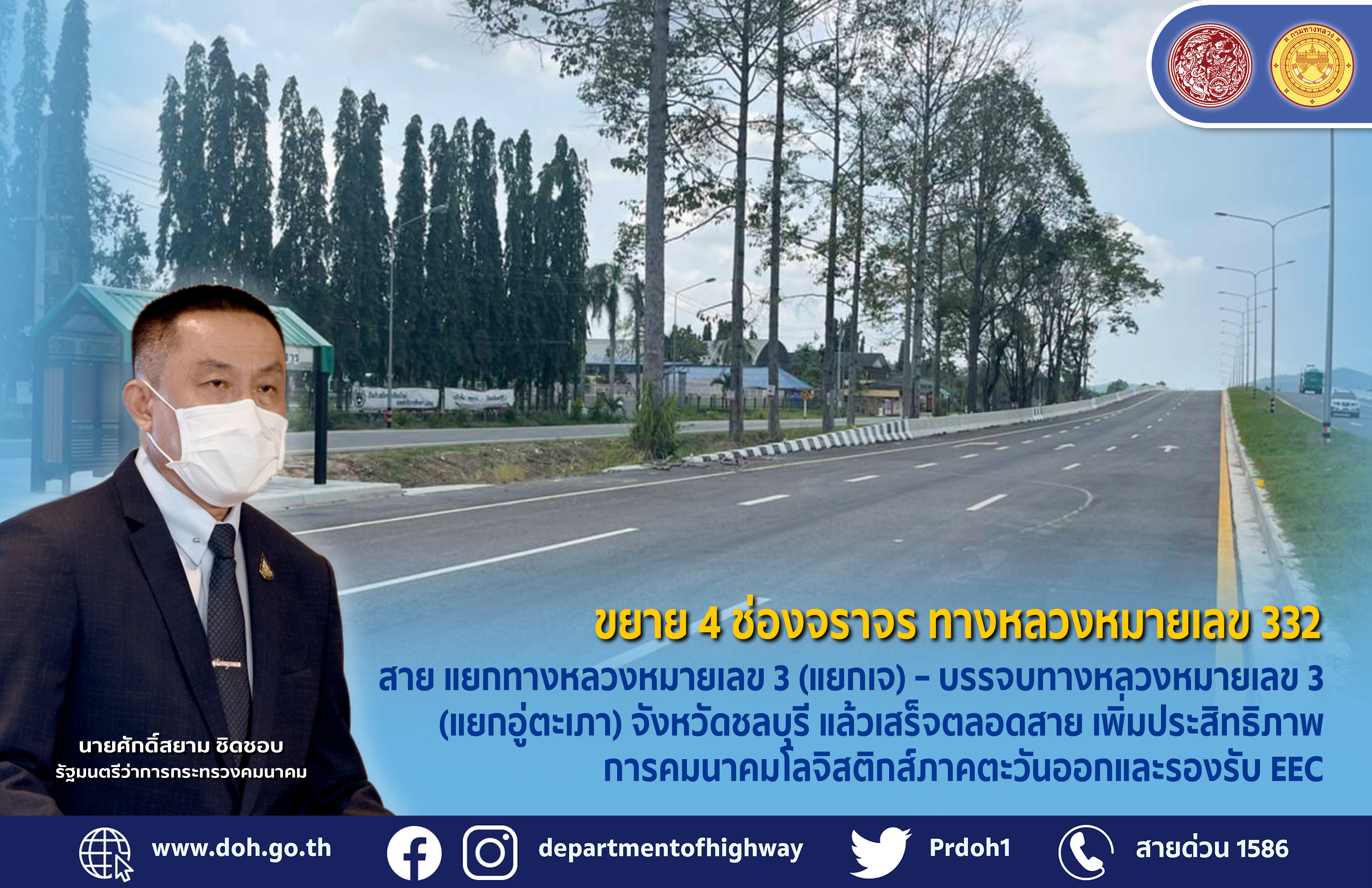 นายสราวุธ ทรงศิวิไล อธิบดีกรมทางหลวง เปิดเผยว่า กรมทางหลวง โดย สำนักงานก่อสร้างทางที่ 2 ดำเนินการก่อสร้างขยาย 4 ช่องจราจร ทางหลวงหมายเลข 332 สาย แยกทางหลวงหมายเลข3 (แยกเจ) – บรรจบทางหลวงหมายเลข 3 (แยกอู่ตะเภา) จังหวัดชลบุรี ระหว่าง กม.0+000 - กม.14+487 รวมระยะทาง 14.47 กิโลเมตร แล้วเสร็จตลอดสาย เพิ่มประสิทธิภาพการคมนาคมโลจิสติกส์ภาคตะวันออก ตามแผนงานบูรณาการขับเคลื่อนเขตพัฒนาเศรษฐกิจพิเศษภาคตะวันออก (อีอีซี) นโยบายนายศักดิ์สยาม ชิดชอบ รัฐมนตรีว่าการกระทรวงคมนาคม
