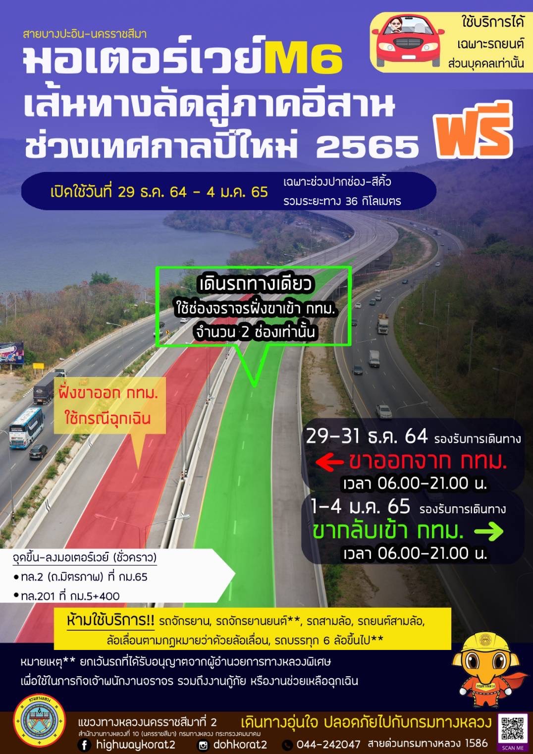 อธิบดีกรมทางหลวง กล่าวต่อไปว่า กรมทางหลวงได้ยกเว้นค่าธรรมเนียมผ่านทางบนทางหลวงพิเศษหมายเลข 7 กรุงเทพ – ชลบุรี – พัทยา – มาบตาพุด ทางหลวงพิเศษหมายเลข 9 บางปะอิน – บางพลี และทางหลวงพิเศษหมายเลข 9พระประแดง –บางขุนเทียน ตั้งแต่เวลา 00.01 น. ของวันที่ 30 ธันวาคม 2564 ถึง เวลา 24.00 น. ของวันที่ 3 มกราคม 2565 นอกจากนี้ จะเปิดให้บริการวิ่งฟรีชั่วคราวบนทางหลวงพิเศษหมายเลข 6 ช่วง ปากช่อง – สีคิ้ว ระยะทาง 35.75 กิโลเมตร ตั้งแต่วันที่ 29 ธ.ค. 64 – 4 ม.ค. 65 เวลา 06.00 – 21.00 น. (โดยจัดการจราจรแบบเดินรถทางเดียว วันที่ 29 – 31 ธ.ค. 64 เดินทางขาออก และวันที่ 1 – 4 ม.ค. 65 เดินทางขาเข้า) เพื่อเพิ่มประสิทธิภาพในการเดินทางสู่ภาคตะวันออกเฉียงเหนือ โดยผู้ใช้ทางสามารถติดตามการรายงานสภาพจริงการจราจร Online แบบ Real time ผ่านแอพพลิเคชั่น M-Traffic (มอเตอร์เวย์) / Thailand Highway Traffic และเฟสบุ๊ค “ศูนย์บริหารจัดการจราจรและอุบัติเหตุกรมทางหลวง”