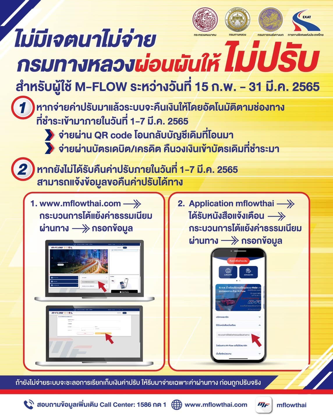 www.mflowthai.com เลือกกระบวนการโต้แย้งค่าธรรมเนียมผ่านทาง หรือดำเนินการผ่าน Application mflowthai เลือกได้รับหนังสือแจ้งเตือน จากนั้นจึงเลือกกระบวนการโต้แย้งค่าธรรมเนียมผ่านทาง แล้วจึงกรอกข้อมูลของตนเอง รวมถึงช่องทางในการคืนเงินค่าปรับ เพื่อนำส่งเงินค่าปรับคืนให้อย่างถูกต้องรวดเร็ว ทั้งนี้ หากผู้ใช้ทางไม่สามารถระบุเวลาเดินทางได้อย่างชัดเจนให้ระบุเวลาประมาณการได้ ระบบจะตรวจสอบข้อมูลและดำเนินการต่อให้ทันที ผู้ใช้ทางมีข้อสงสัยหรือต้องการสอบถามข้อมูลเพิ่มเติมสามารถติดต่อได้ที่ Call Center 1586 กด 1 หรือทาง Line Official Account : @mflowthai และ facebook : mflowthailand