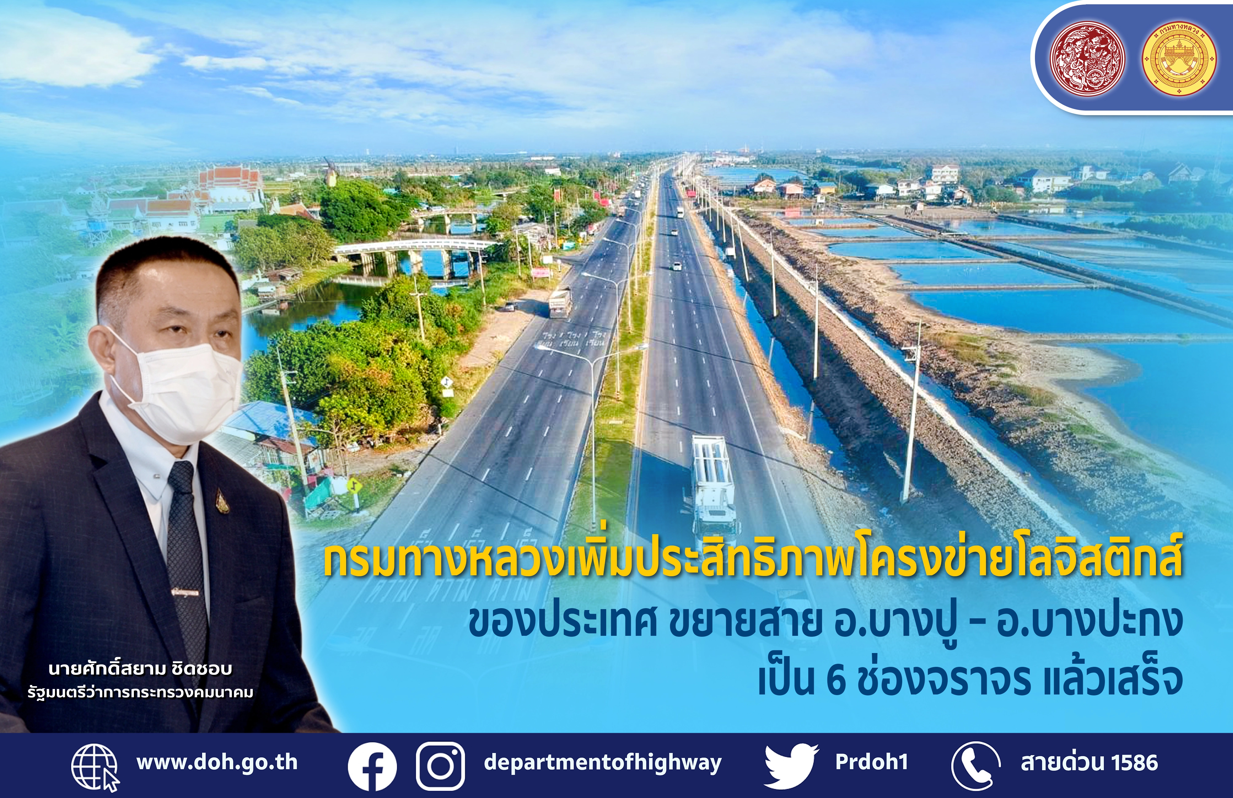 กรมทางหลวงโดย สำนักก่อสร้างทางที่ 1 เปิดเผยความคืบหน้าโครงการก่อสร้างทางหลวงหมายเลข 3 สาย บางปู – อ.บางปะกง ระหว่าง กม.47+450 – กม.76+022 ระยะทาง 28.75 กิโลเมตร แล้วเสร็จ ในพื้นที่ อำเภอบางบ่อ จังหวัดสมุทรปราการ ถึง อำเภอบางปะกง จ.ฉะเชิงเทรา ตามนโยบายของ นายศักดิ์สยาม ชิดชอบ รัฐมนตรีว่าการกระทรวงคมนาคม ที่ต้องการบูรณาการเขตพัฒนาพิเศษภาตะวันออก นำความเจริญมาสู่ทุกภูมิภาค