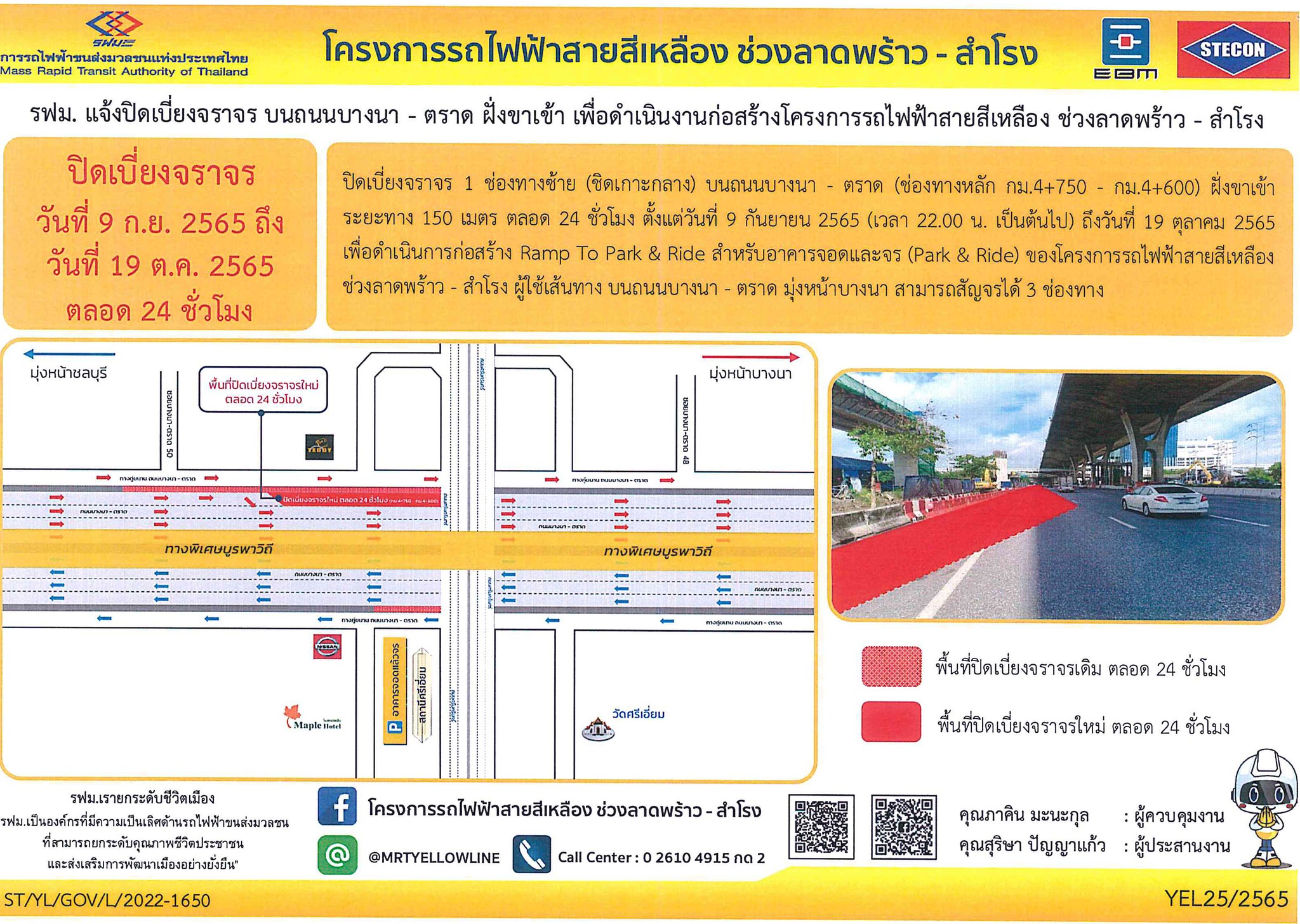 กรมทางหลวง โดยแขวงทางหลวงสมุทรปราการ แจ้งเบี่ยงจราจรเนื่องจากโครงการรถไฟฟ้าสายสีเหลือง ช่วงลาดพร้าว – สำโรง จะเข้าทำการปิดเบี่ยงจราจรชั่วคราว บนทางหลวงแผ่นดินหมายเลข 34 (ถนนเทพรัตน) ตอน บางนา – ทางเข้าท่าอากาศยานสุวรรณภูมิ ระหว่าง กม.4+750 – กม.4+600 ฝั่งขาเข้า ด้านในบริเวณใต้ทางพิเศษบูรพาวิถี เพื่อดำเนินการก่อสร้างทางลาดสำหรับอาคารจอดและจร (Park & Ride) โดยปิดเบี่ยงการจราจร 1 ช่องจราจร ด้านขวาทางชิดเกาะกลาง ระหว่างทางหลักกับคู่ขนานขาเข้าตลอด 24 ชั่วโมง ระยะทาง 150 เมตร ตั้งแต่บัดนี้เป็นต้นไป ถึงวันที่ 19 ตุลาคม 2565