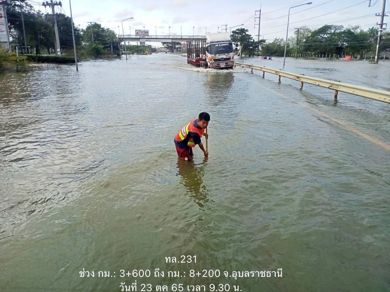 - ทางหลวงหมายเลข 231 ถนนวงแหวนรอบเมืองอุบลราชธานี ในพื้นที่ อ.เมือง ช่วง กม.ที่ 3+600 – 8+200 ระดับน้ำ 45 - 100 ซม. ใช้ทางเลี่ยงถนนวงแหวนด้านทิศตะวันออก ทล.231 คาดว่าการจราจรจะผ่านได้ 5 พฤศจิกายน 2565