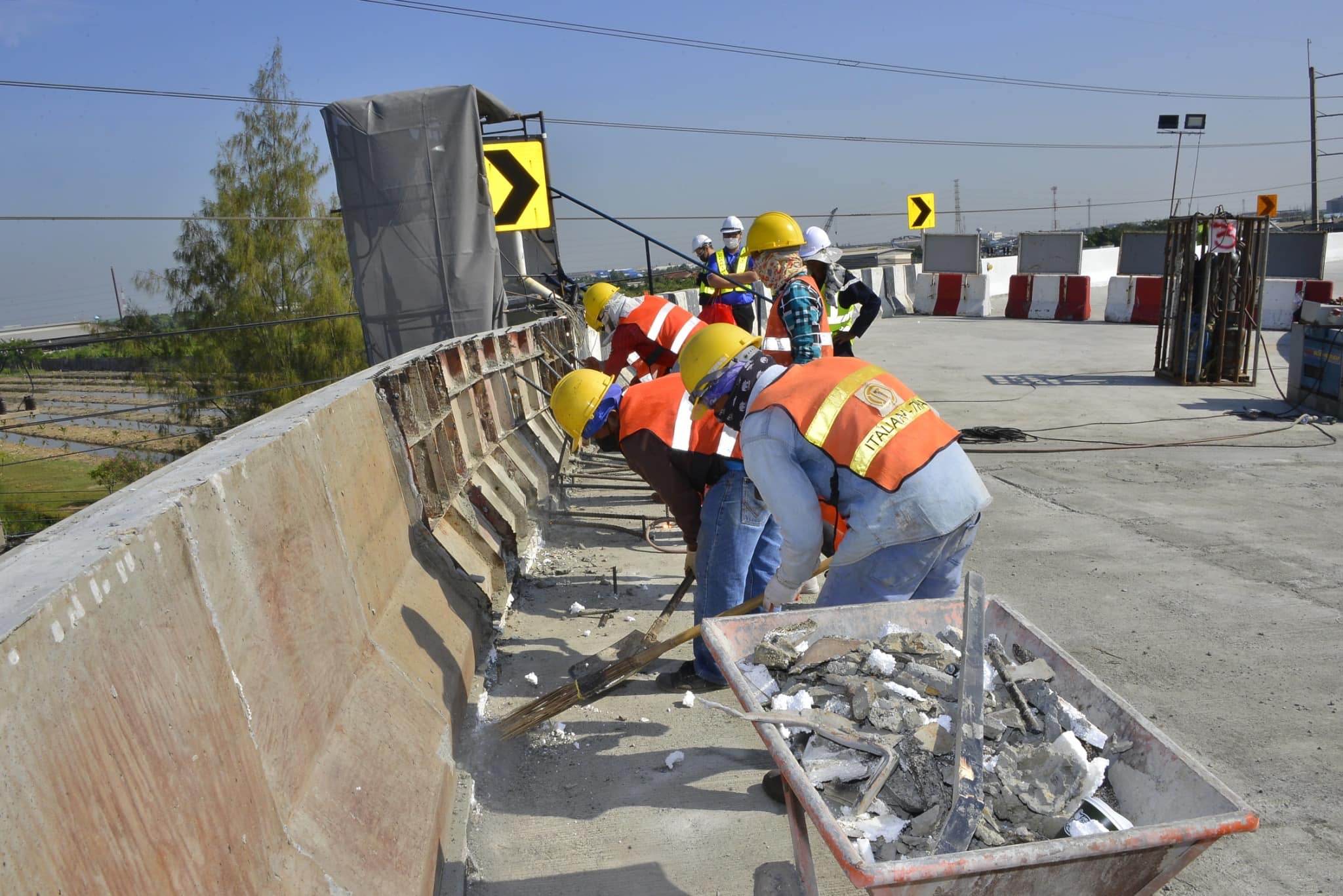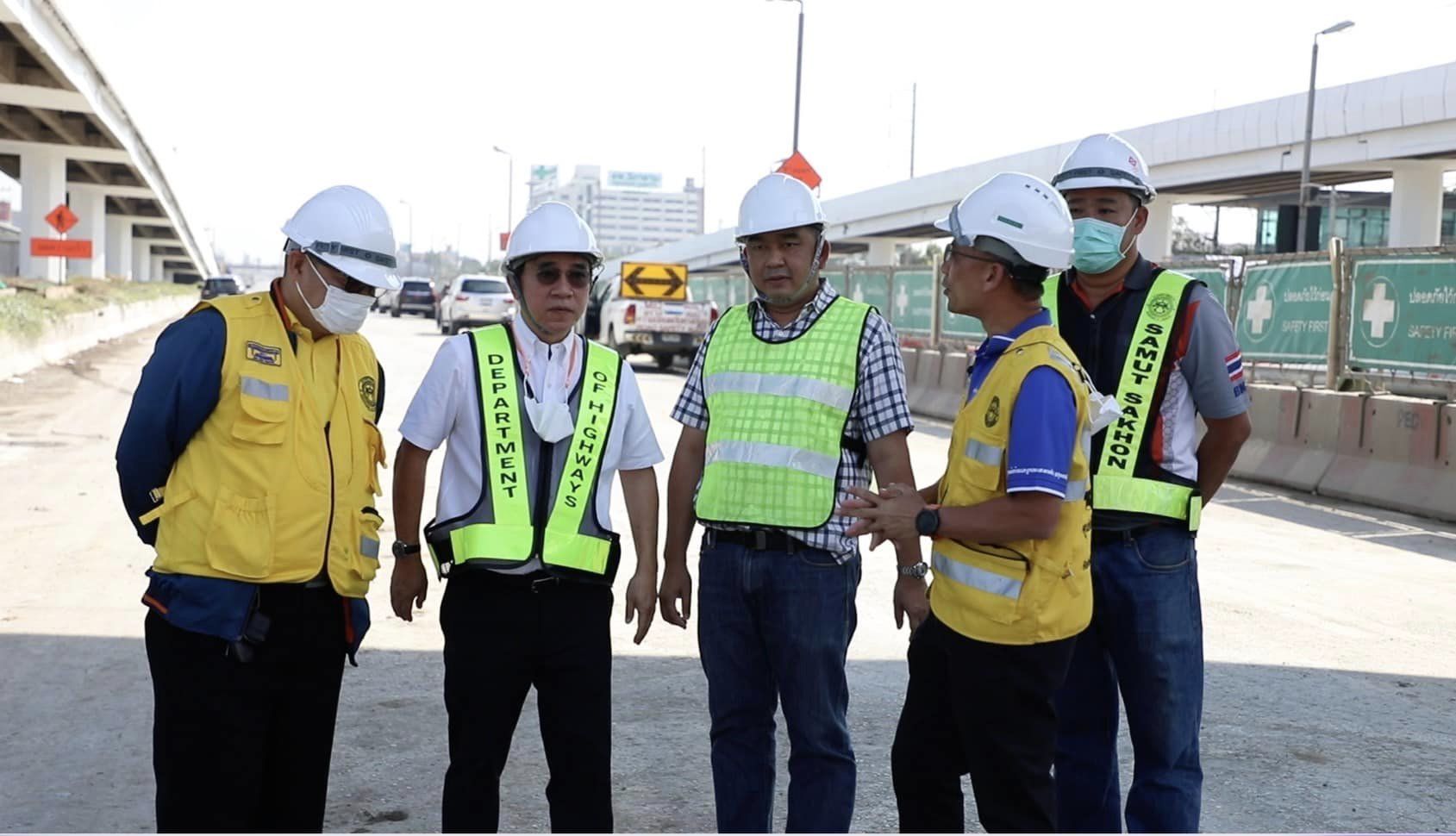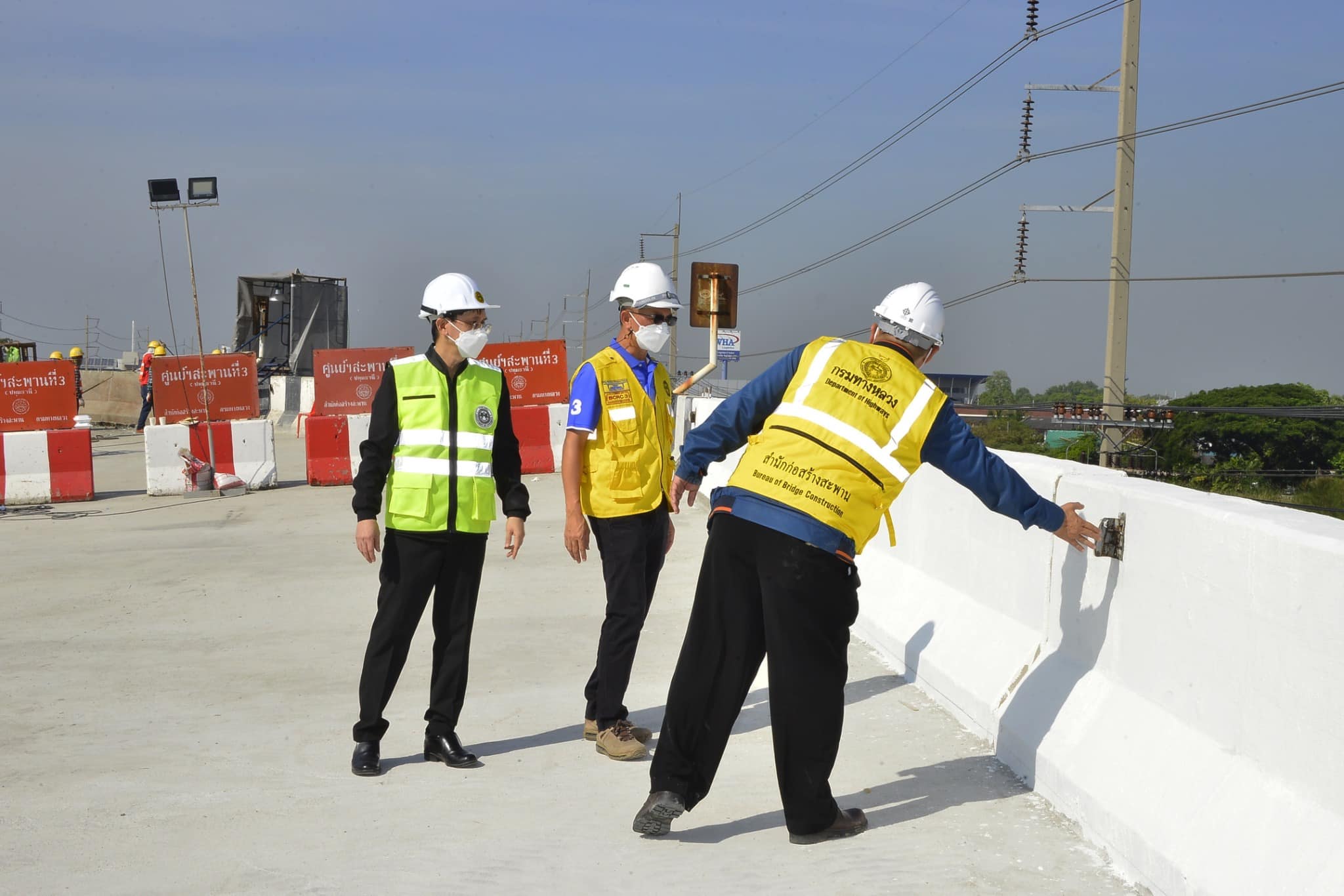 วันนี้ (3 พฤศจิกายน 2565) เวลา 09.00 น. นายสราวุธ ทรงศิวิไล อธิบดีกรมทางหลวง มอบหมายให้นายไพฑูรย์ พงษ์ชวลิต รองอธิบดีกรมทางหลวง นายทวีศักดิ์ รุจิจรรยาวัฒน์ ผอ.สำนักก่อสร้างสะพาน นายพรชัย ศิลารมย์ ผอ.ศูนย์สร้างและบูรณะสะพานที่ 3 (ปทุมธานี) นายประลองยุทธ์ กสิวงศ์ ผอ.แขวงทางหลวงสมุทรสาคร และเจ้าหน้าที่ที่เกี่ยวข้อง ร่วมลงพื้นที่พร้อมด้วย รศ.เอนก ศิริพานิชกร และ รศ.ดร.ภาณุวัฒน์ จ้อยกลัด ผู้แทนจากวิศวกรรมสถานแห่งประเทศไทย ในพระบรมราชูปถัมภ์ (วสท.) เพื่อกำกับติดตามการดำเนินงานซ่อมแซมและบูรณะโครงสร้างสะพานลอยกลับรถ (หน้า รพ.วิภาราม) บนทางหลวงหมายเลข 35 (ถนนพระรามที่ 2) ที่ กม.34 ฝั่งขาเข้ากรุงเทพฯ ซึ่งดำเนินการระหว่างวันที่ 31 ต.ค. 65 - 4 พ.ย. 65 โดยภารกิจหลักในวันนี้เป็นการดำเนินการถอดแบบหล่อและทาสี Concrete Barriers พร้อมจัดเก็บรายละเอียดต่าง ๆ และทำความสะอาดผิวทาง ซึ่งในการดำเนินการยังมีความจำเป็นต้องปิดการจราจรบนเส้นทางหลักและเปิดช่องทางเบี่ยงออกทางขนานบริเวณด้านล่าง เพื่อความปลอดภัยของผู้ใช้ทาง