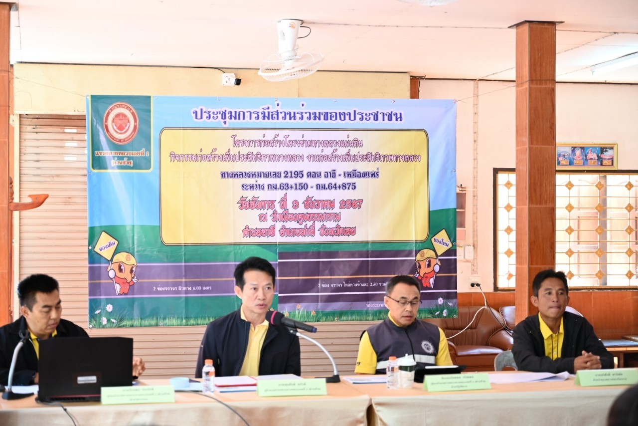 การประชุมการมีส่วนร่วมของประชาชน เพื่อชี้แจงรายละเอียดและรับฟังความคิดเห็นและข้อเสนอแนะโครงการพัฒนาทางหลวงเพื่อสนับสนุนระบบคมนาคมและโลจิสติกส์ กิจกรรมก่อสร้างเพิ่มประสิทธิภาพ ทางหลวง งานก่อสร้างเพิ่มประสิทธิภาพทางหลวง ทางหลวงหมายเลข 2195 ตอน อาฮี - เหมืองแพร่ ระหว่าง กม.109+050 - กม.111+050