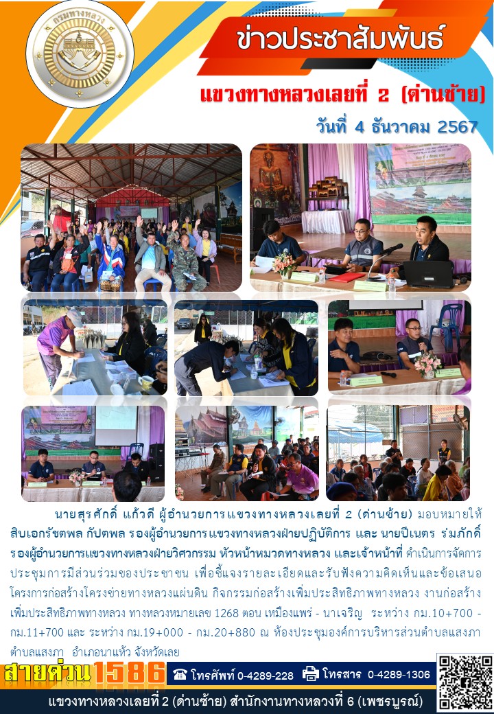 การประชุมการมีส่วนร่วมของประชาชน เพื่อชี้แจงรายละเอียดและรับฟังความคิดเห็นและข้อเสนอแนะ โครงการก่อสร้างโครงข่ายทางหลวงแผ่นดิน กิจกรรมก่อสร้างเพิ่มประสิทธิภาพทางหลวง งานก่อสร้าง เพิ่มประสิทธิภาพทางหลวง ทางหลวง หมายเลข 1268 ตอนควบคุม 0100 ตอน เหมืองแพร่ - นาเจริญ ระหว่าง กม.20+880 - กม.22+130