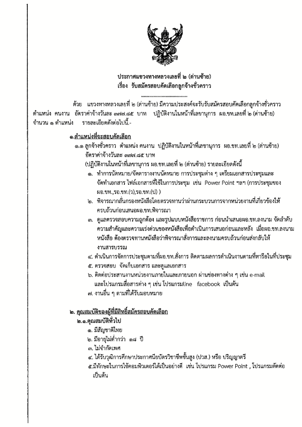 แขวงทางหลวงเลยที่ 2 (ด่านซ้าย) เปิดรับสมัครสอบคัดเลือกลูกจ้างชั่วคราวปฏิบัติงานเลขานุการ 1 ตำแหน่ง ระหว่างวันที่ 21 - 23 กุมภาพันธ์ 2565 สอบถามรายละเอียดเพิ่มเติมได้ที่ สำนักงานแขวงทางหลวงเลยที่ 2 (ด่านซ้าย) หมายเลขโทรศัพท์ 042891228 ในวันและเวลาราชการ