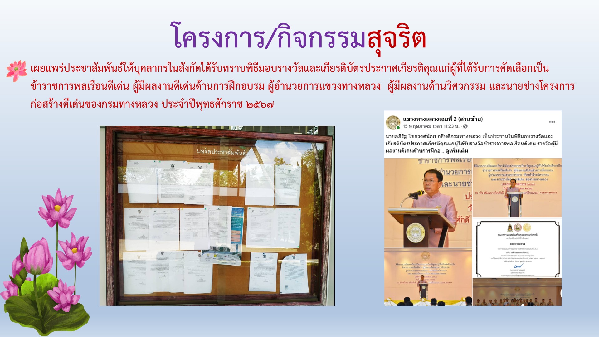 แขวงทางหลวงเลยที่ 2 (ด่านซ้าย) รายงานผลการดำเนินงานตามแผนปฏิบัติการส่งเสริมคุณธรรมจริยธรรม ประจำปีงบประมาณ พ.ศ.2568 คุณธรรม 5 ประการ