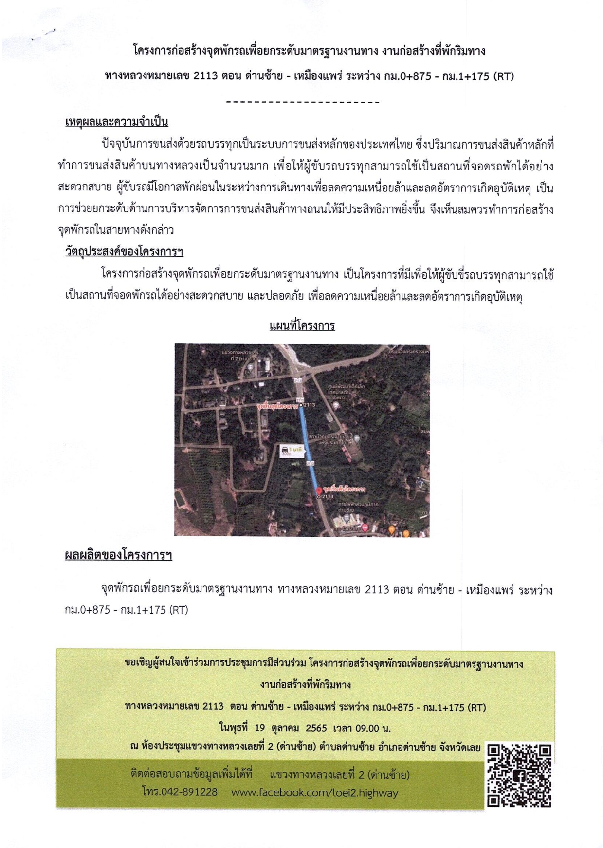 วันพุธที่ 19 ตุลาคม 2565 เวลา 09.00 น. ขอเชิญผู้สนใจเข้าร่วมการประชุมการมีส่วนร่วมโครงการก่อสร้างจุดพักรถเพื่อยกระดับมาตรฐานงานทาง งานก่อสร้างที่พักริมทาง ทางหลวงหมายเลข 2113 ตอน ด่านซ้าย - เหมืองแพร่ ระหว่าง กม.0+875 - กม.1+175 ณ ห้องประชุมแขวงทางหลวงเลยที่ 2 (ด่านซ้าย) อำเภอด่านซ้าย จังหวัดเลย