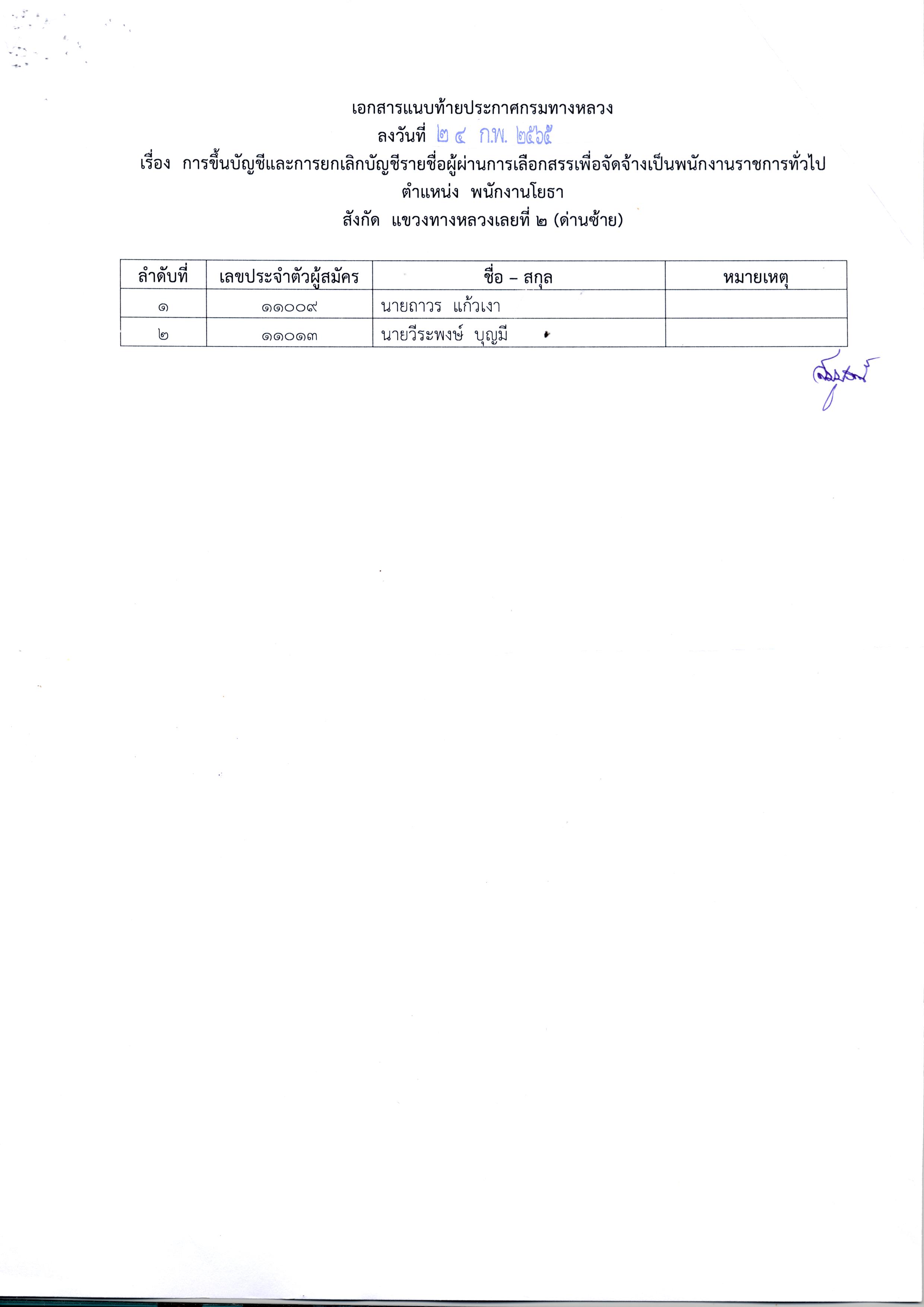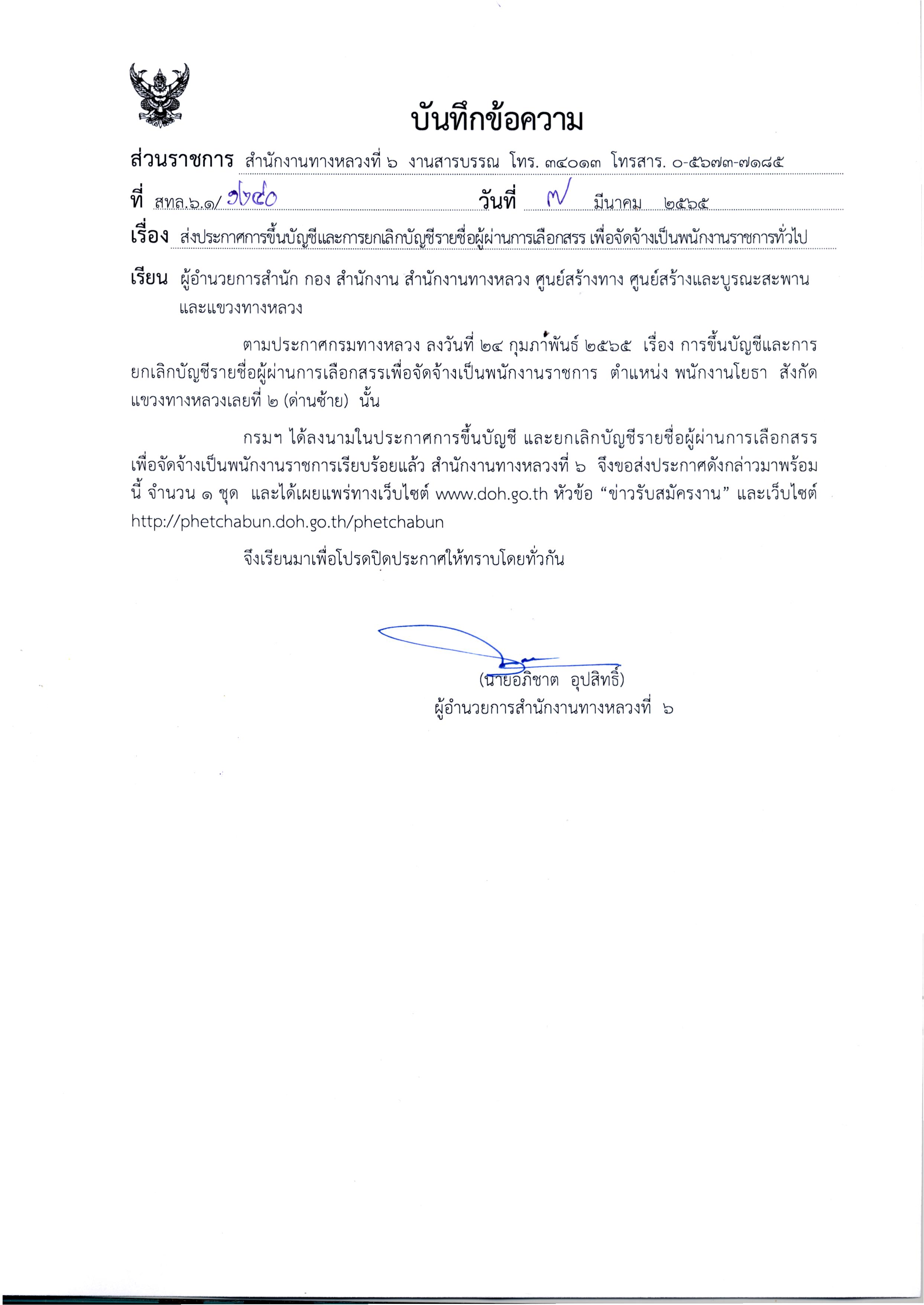 สำนักงานทางหลวงที่ 6 (เพชรบูรณ์) ประกาศผลสอบผู้ผ่านการเลือกสรรเพื่อจัดจ้างเป็นพนักงานราชการทั่วไป ตำแหน่งพนักงานโยธา