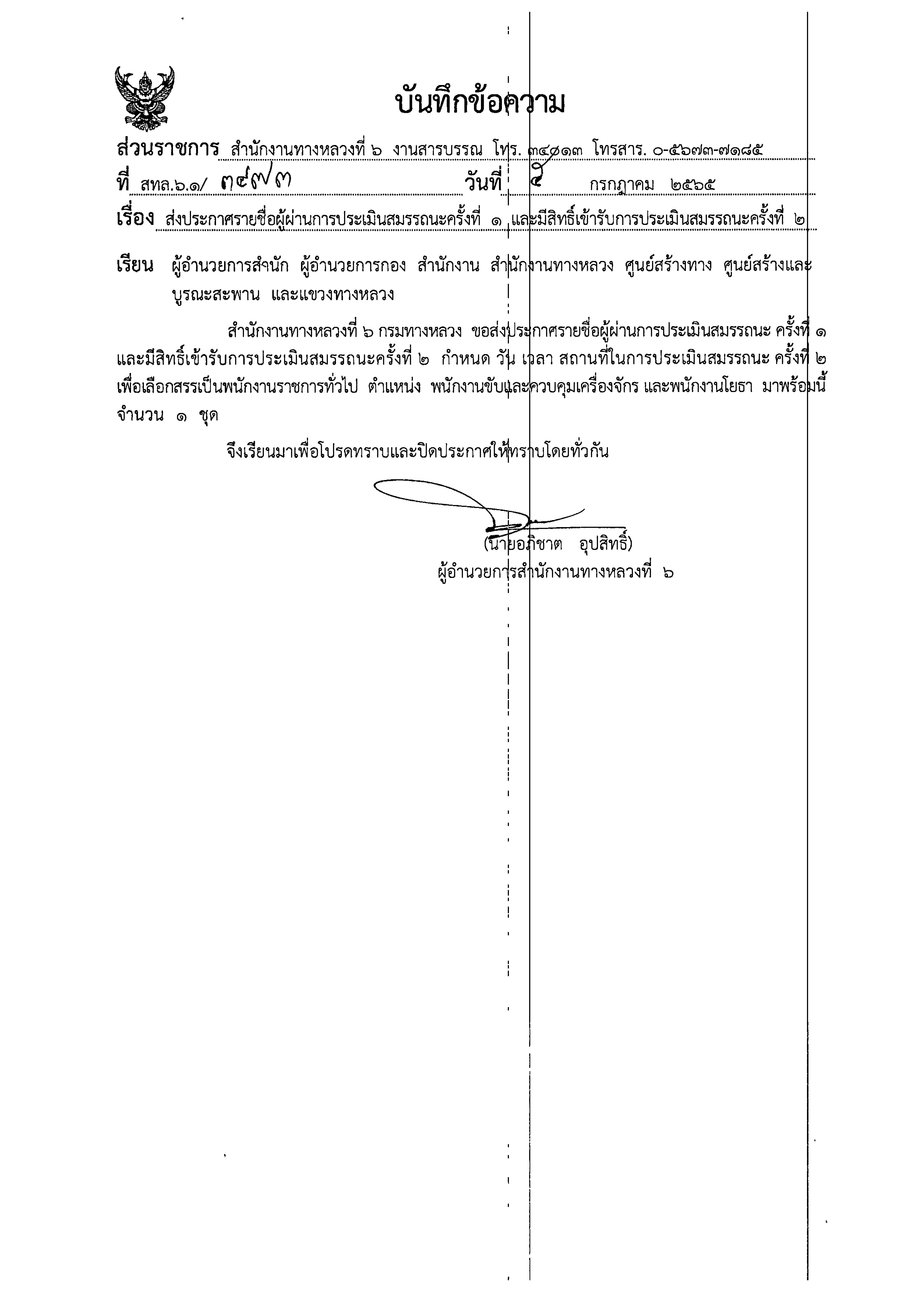 ประกาศผลสอบผู้ผ่านการประเมินสมรรถนะครั้งที่ 1 และมีสิทธิเข้ารับการประเมินสมรรถนะครั้งที่ 2 ตำแหน่งพนักงานขับและควบคุมเครื่องจักร, ตำแหน่งพนักงานโยธา