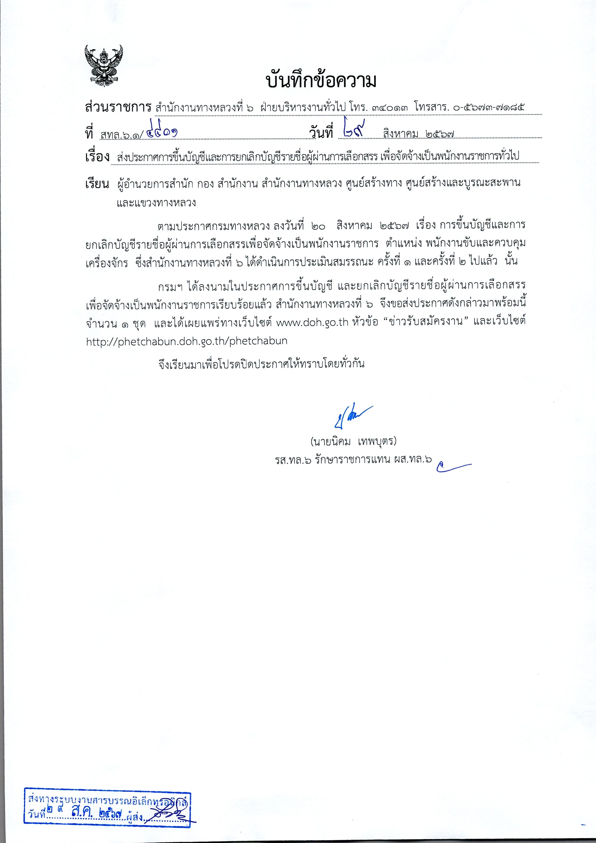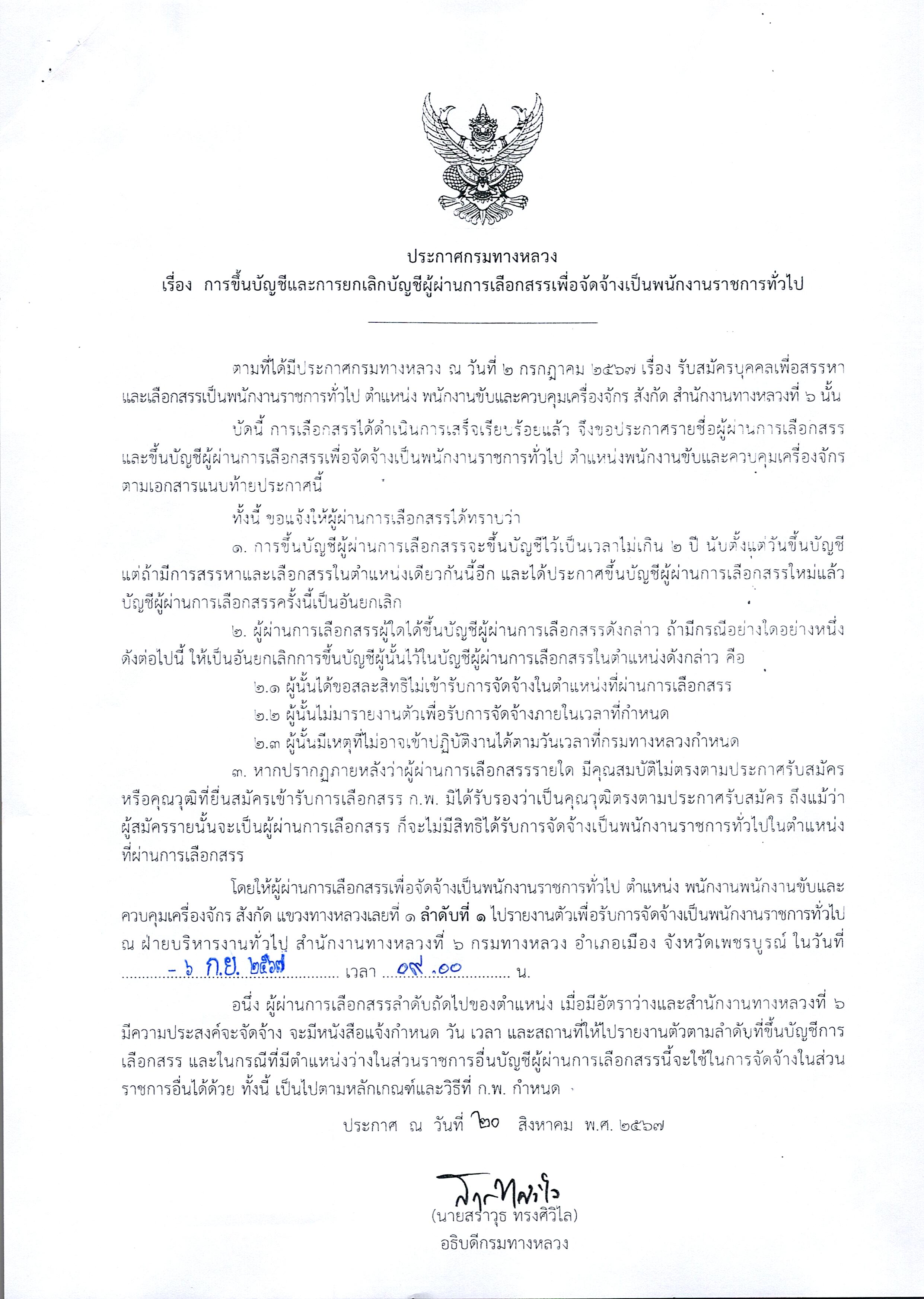 สำนักงานทางหลวงที่ 6 (เพชรบูรณ์) ประกาศผลสอบผู้ผ่านการเลือกสรรเพื่อจัดจ้างเป็นพนักงานราชการทั่วไป ตำแหน่งพนักงานขับและควบคุมเครื่องจักร