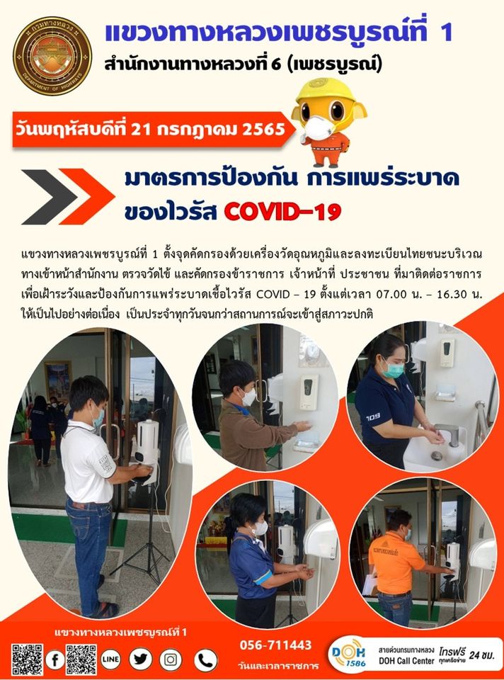 วันพฤหัสบดีที่ 21 กรกฎาคม 2565 แขวงทางหลวงเพชรบูรณ์ที่ 1 ตั้งจุดคัดกรองด้วยเครื่องวัดอุณหภูมิและลงทะเบียนไทยชนะ บริเวณทางเข้าหน้าสำนักงาน ตรวจวัดไข้ และคัดกรองข้าราชการ เจ้าหน้าที่ ประชาชน ที่มาติดต่อราชการ เพื่อเฝ้าระวังและป้องกันการแพร่ระบาดเชื้อไวรัส COVID – 19