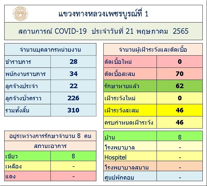 รายงานสถานการณ์ COVID-19 แขวงทางหลวงเพชรบูรณ์ที่ 1 ประจำวันที่ 21 พฤษภาคม 2565