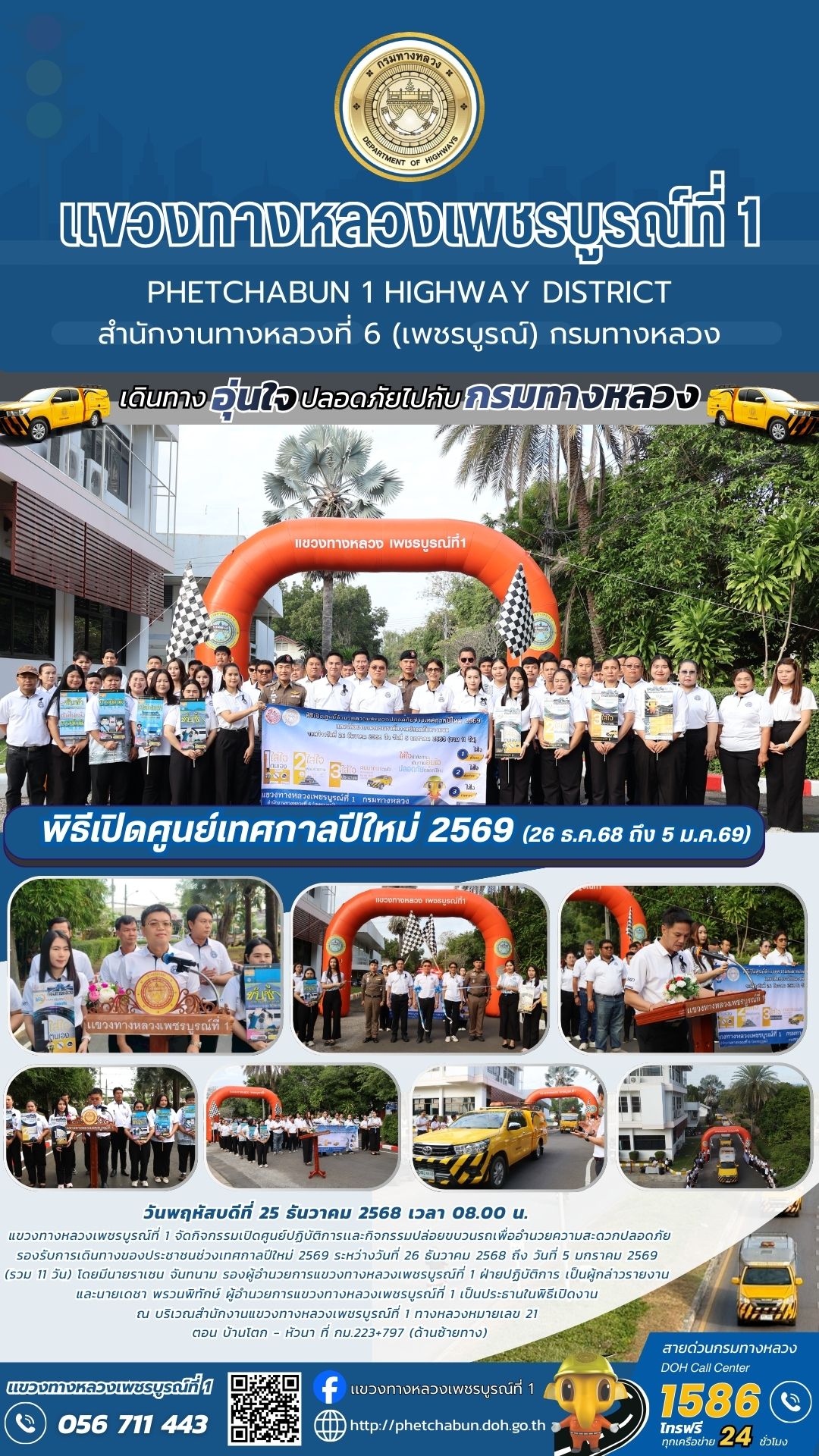 แขวงทางหลวงเพชรบูรณ์ที่ 1 จัดกิจกรรมเปิดศูนย์ปฏิบัติการเเละกิจกรรมปล่อยขบวนรถเพื่ออำนวยความสะดวกปลอดภัย รองรับการเดินทางของประชาชนช่วงเทศกาลปีใหม่ 2569 ระหว่างวันที่ 26 ธันวาคม 2568 ถึง วันที่ 5 มกราคม 2569 (รวม 11 วัน)