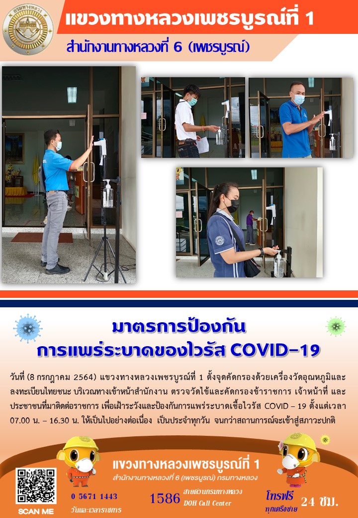 แขวงทางหลวงเพชรบูรณ์ที่ 1 จัดตั้งตู้พ่นน้ำยาฆ่าเชื้อ และจุดคัดกรองด้วยเครื่องวัดอุณหภูมิ วันที่ 8 กรกฎาคม 2564 ตั้งแต่เวลา 07.00 น. – 16.30 น.