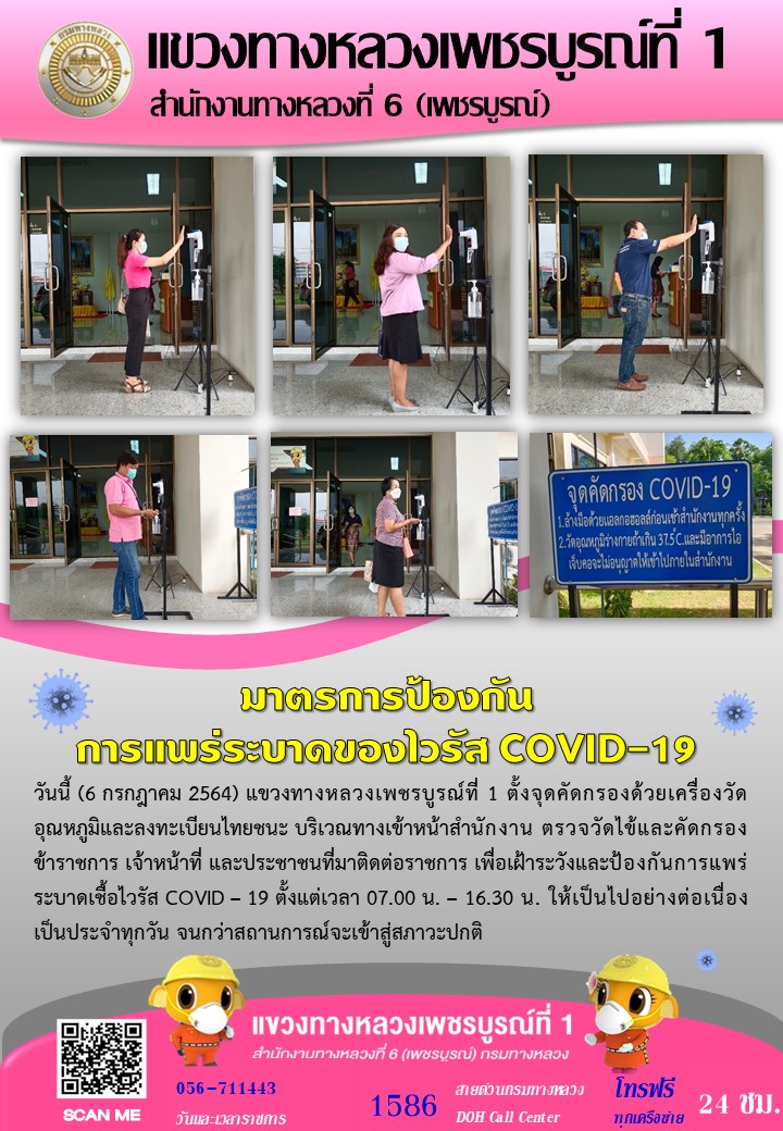 แขวงทางหลวงเพชรบูรณ์ที่ 1 จัดตั้งตู้พ่นน้ำยาฆ่าเชื้อ และจุดคัดกรองด้วยเครื่องวัดอุณหภูมิ วันที่ 6 กรกฎาคม 2564 ตั้งแต่เวลา 07.00 น. – 16.30 น.