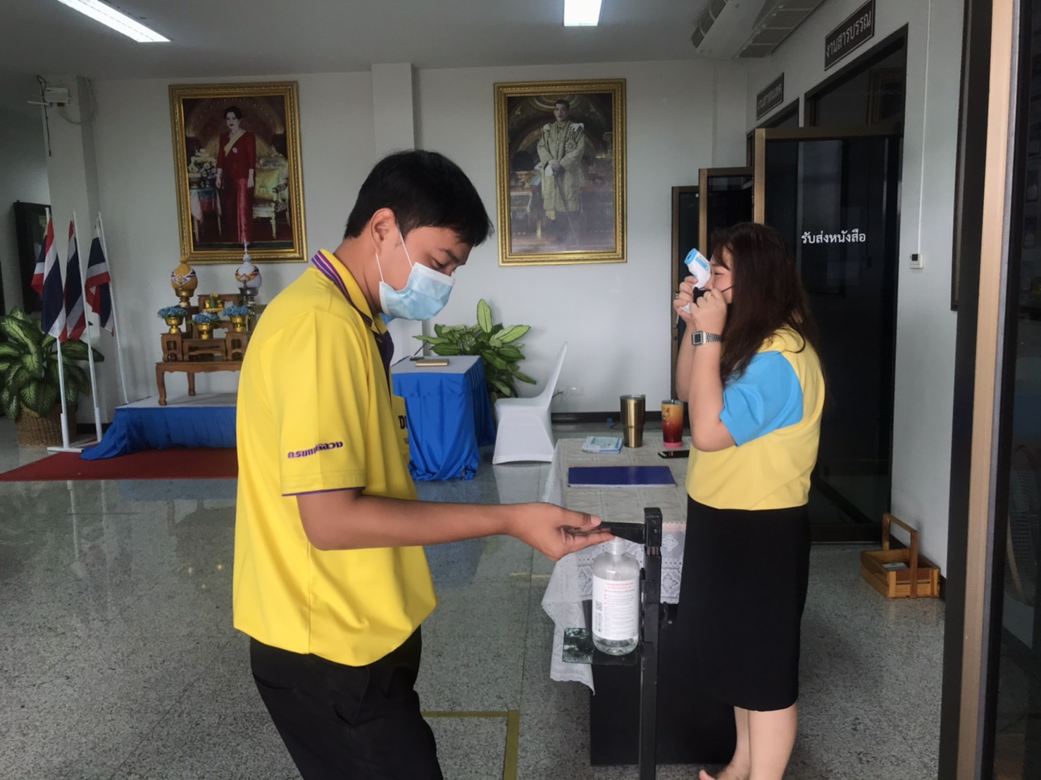 จัดตั้งตู้พ่นน้ำยาฆ่าเชื้อ และจุดคัดกรองด้วยเครื่องวัดอุณหภูมิ