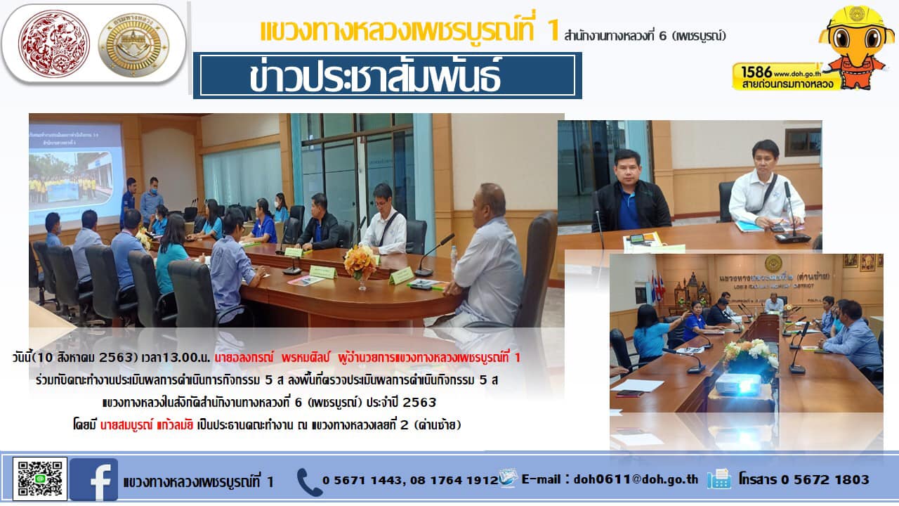 ร่วมกับคณะทำงานประเมินผลการดำเนินการกิจกรรม 5 ส ลงพื้นที่ตรวจประเมินผลการดำเนินกิจกรรม 5 ส แขวงทางหลวงในสังกัดสำนักงานทางหลวงที่ 6 (เพชรบูรณ์) |