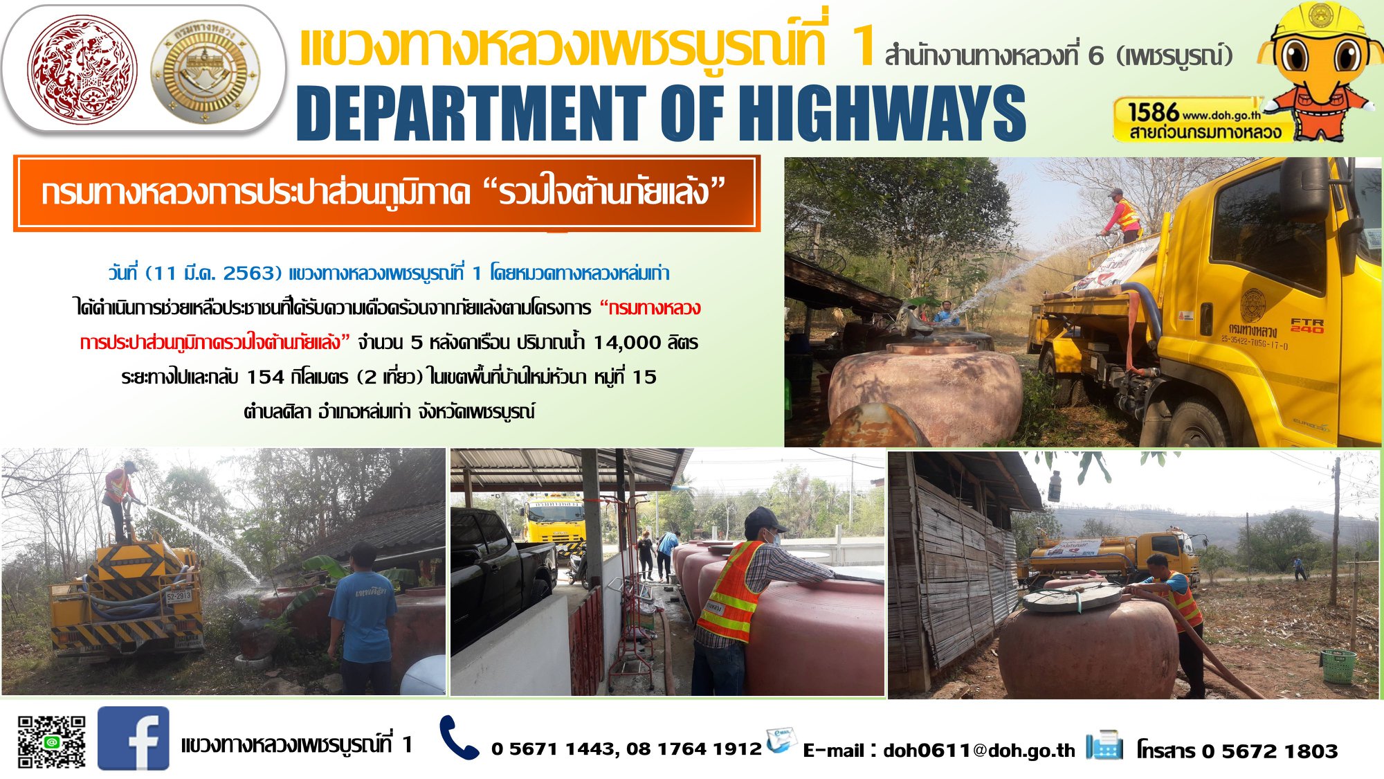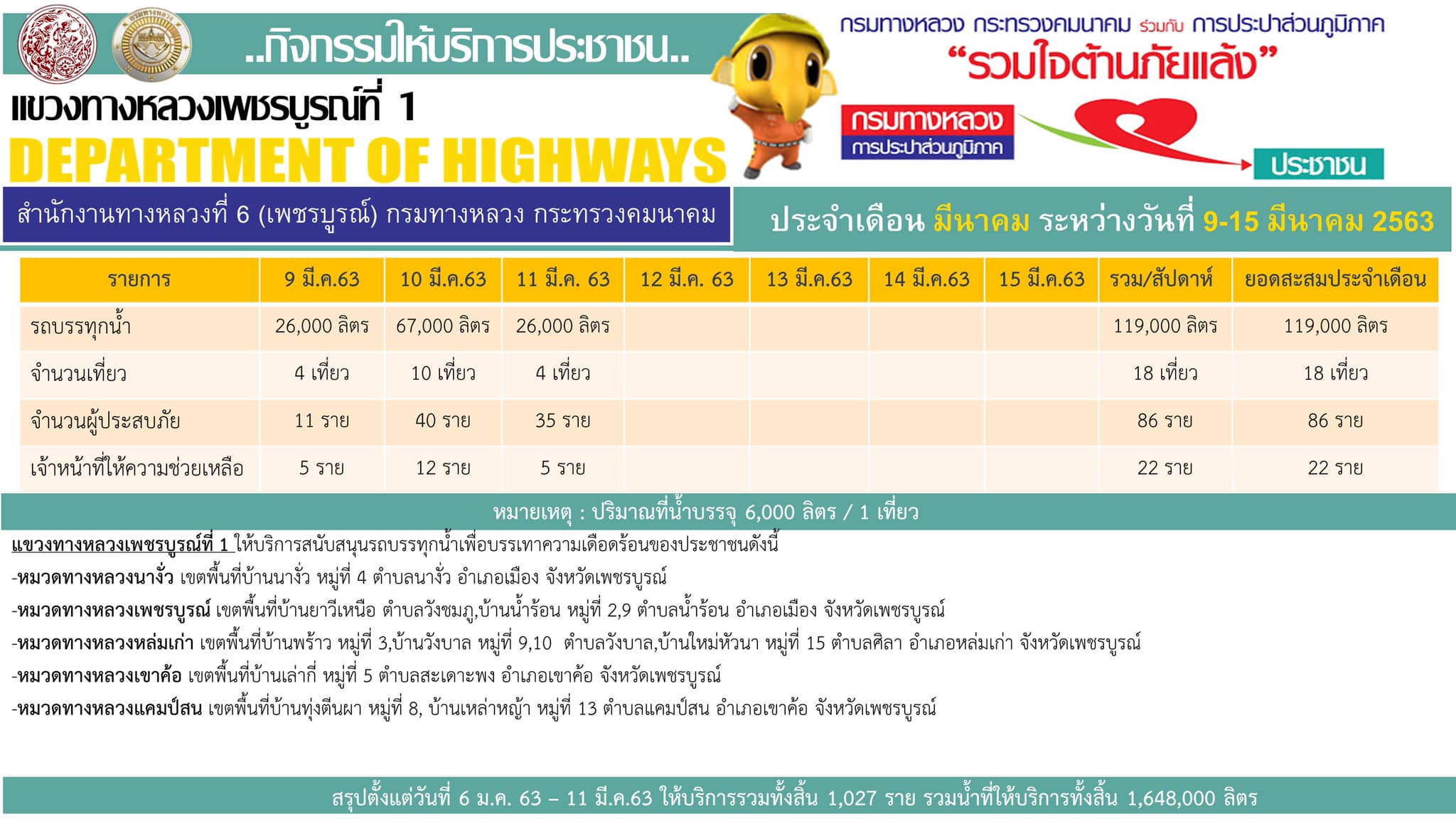 ดำเนินการช่วยเหลือประชาชนที่ได้รับความเดือดร้อนจากภัยแล้งตามโครงการ “กรมทางหลวง การประปาส่วนภูมิภาครวมใจต้านภัยแล้ง” ตั้งแต่วันที่ 6 ม.ค. 63 – 11 มีนาคม 63 ให้
