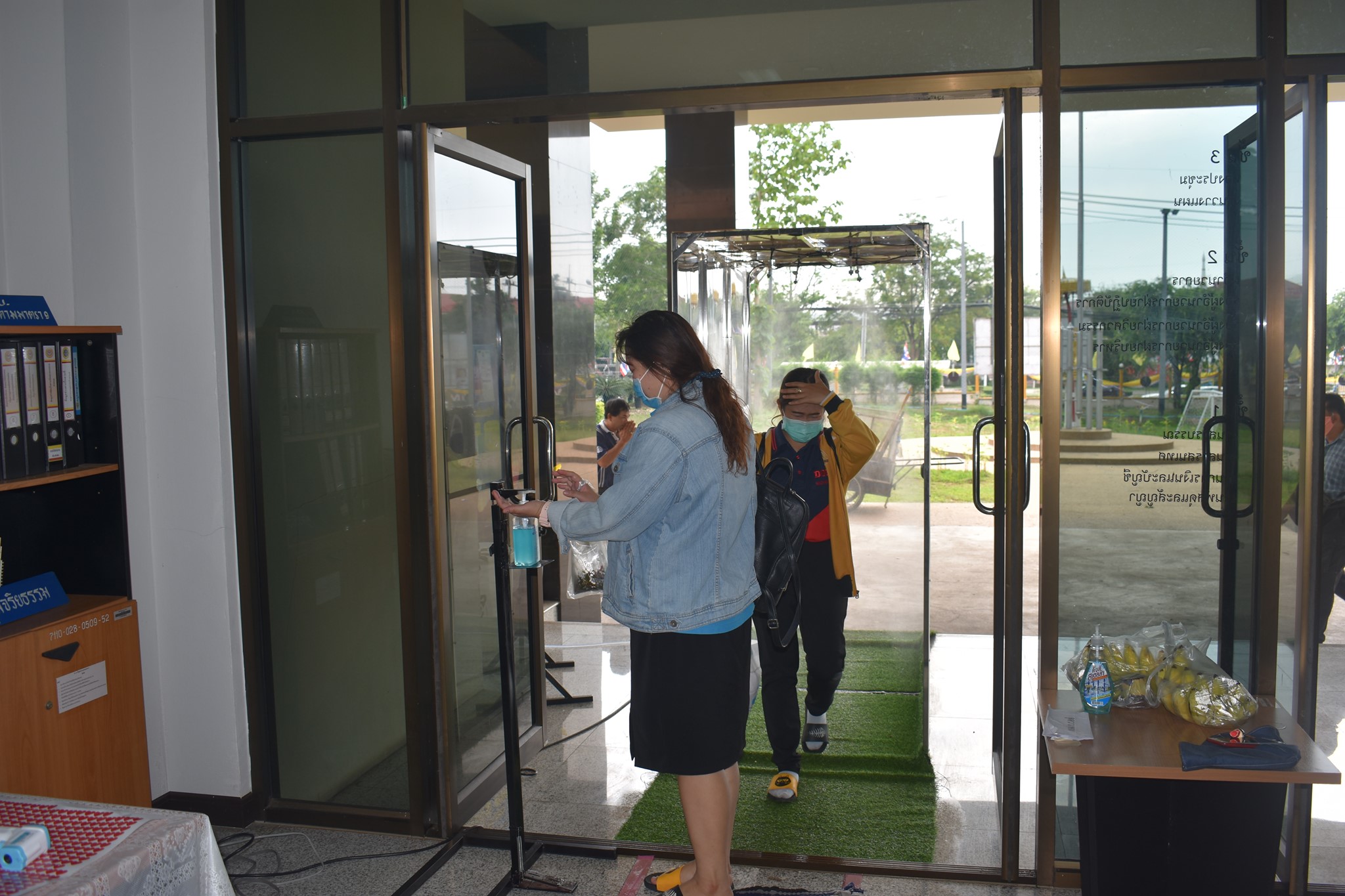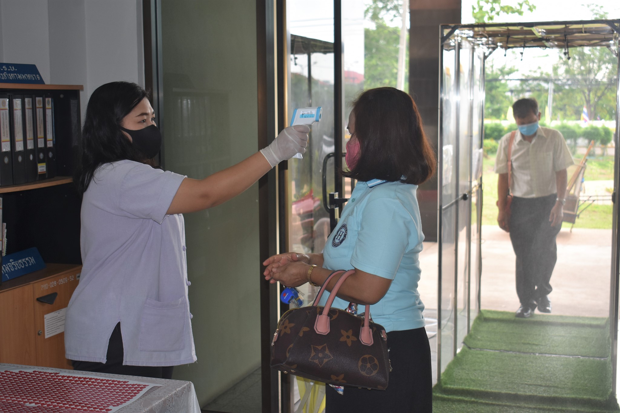 และจุดคัดกรองด้วยเครื่องวัดอุณหภูมิ บริเวณทางเข้าด้านหน้าสำนักงาน ตรวจวัดไข้และคัดกรองข้าราชการ เจ้าหน้าที่ และประชาชนที่มาติดต่อราชการ เพื่อเฝ้าระวังและป้องกัน การแพร่ระบาด เชื้อไวรัส COVID – 19 ตั้งแต่เวลา 07.00 น. – 16.30 น. ให้เป็นไปอย่างต่อเนื่องเป็นประจำทุกวัน จนกว่าสถานการณ์จะเข้าสู่สภาวะปกติ