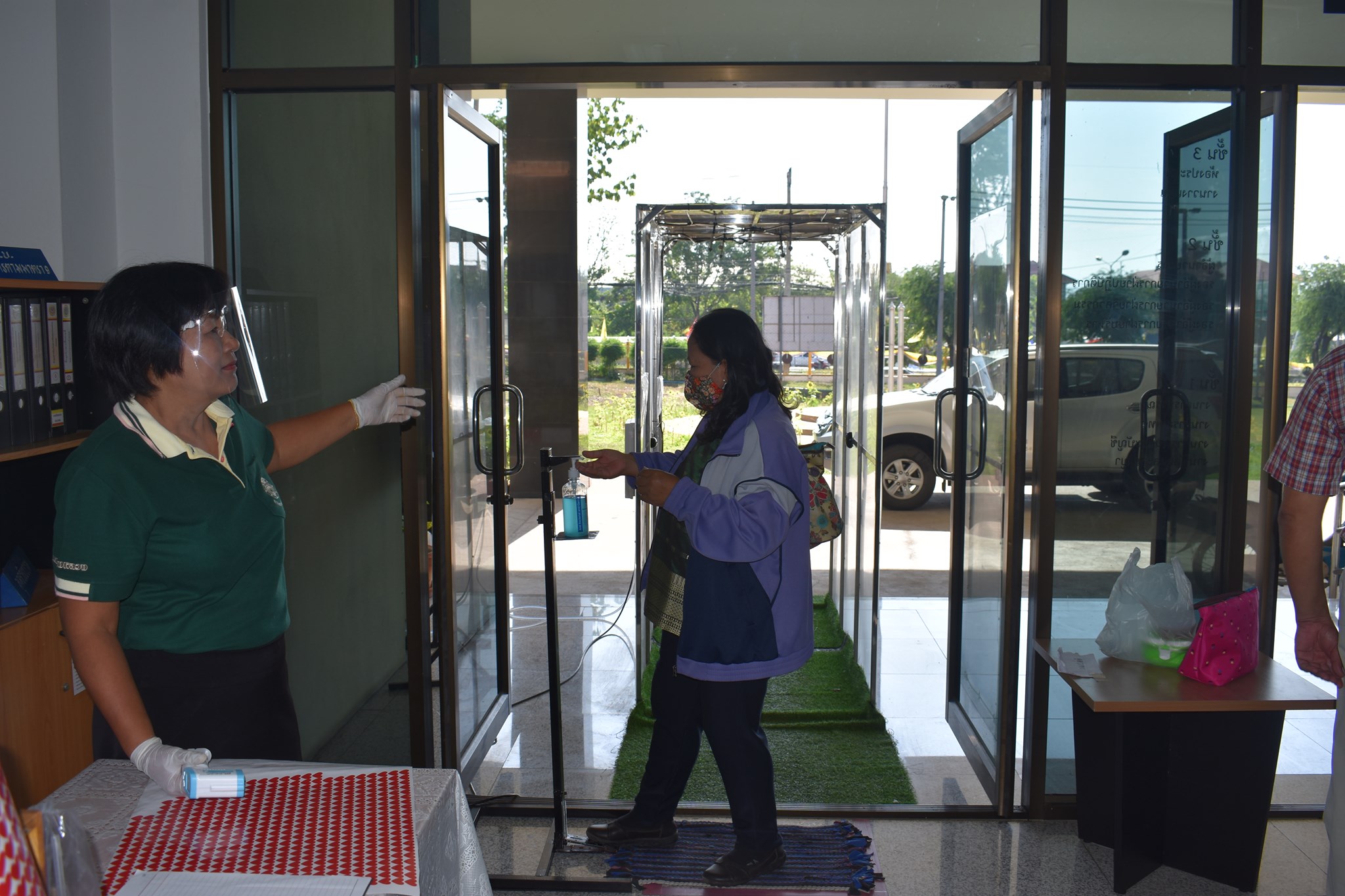 จัดตั้งตู้พ่นน้ำยาฆ่าเชื้อ และจุดคัดกรองด้วยเครื่องวัดอุณหภูมิ