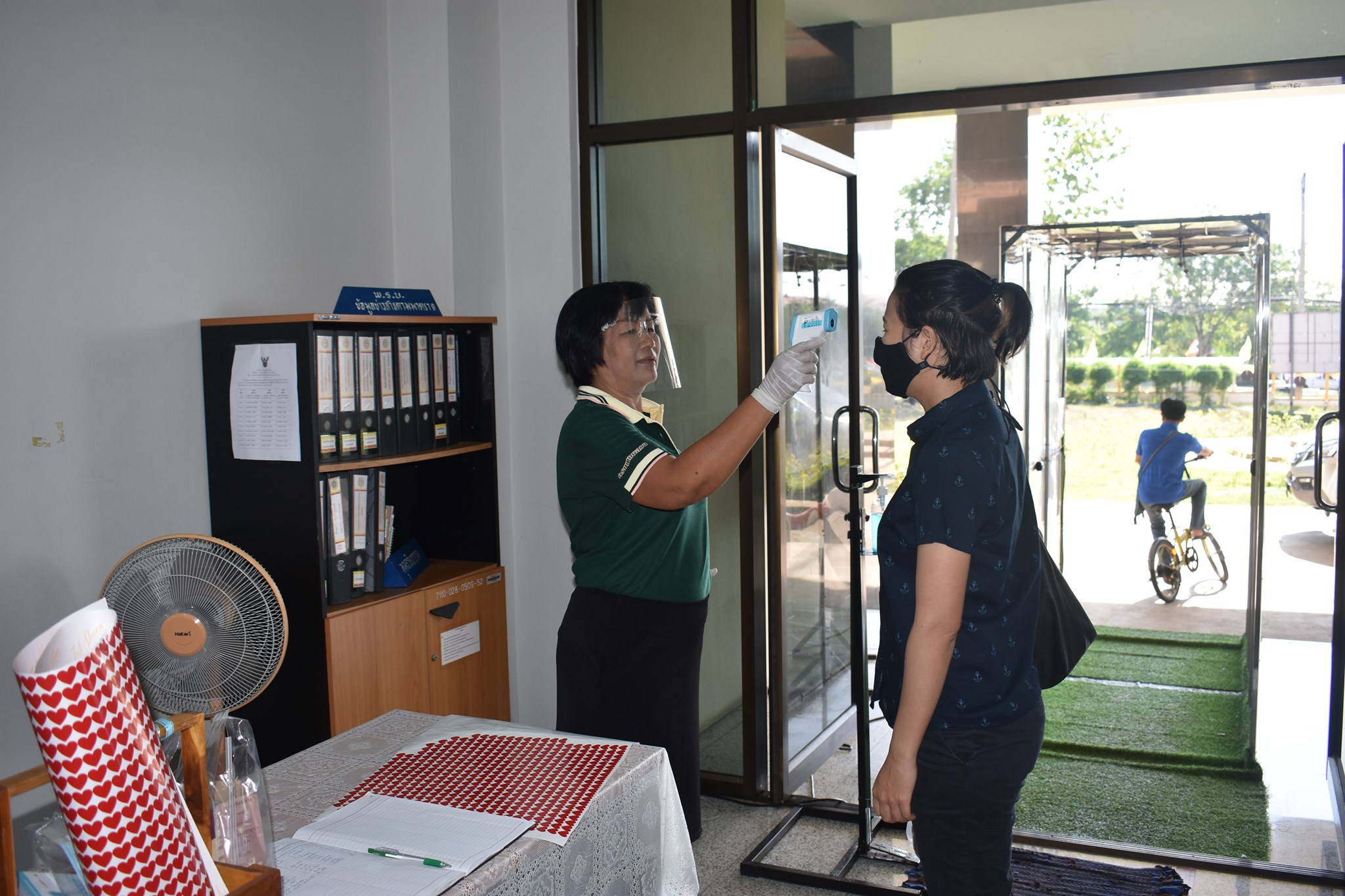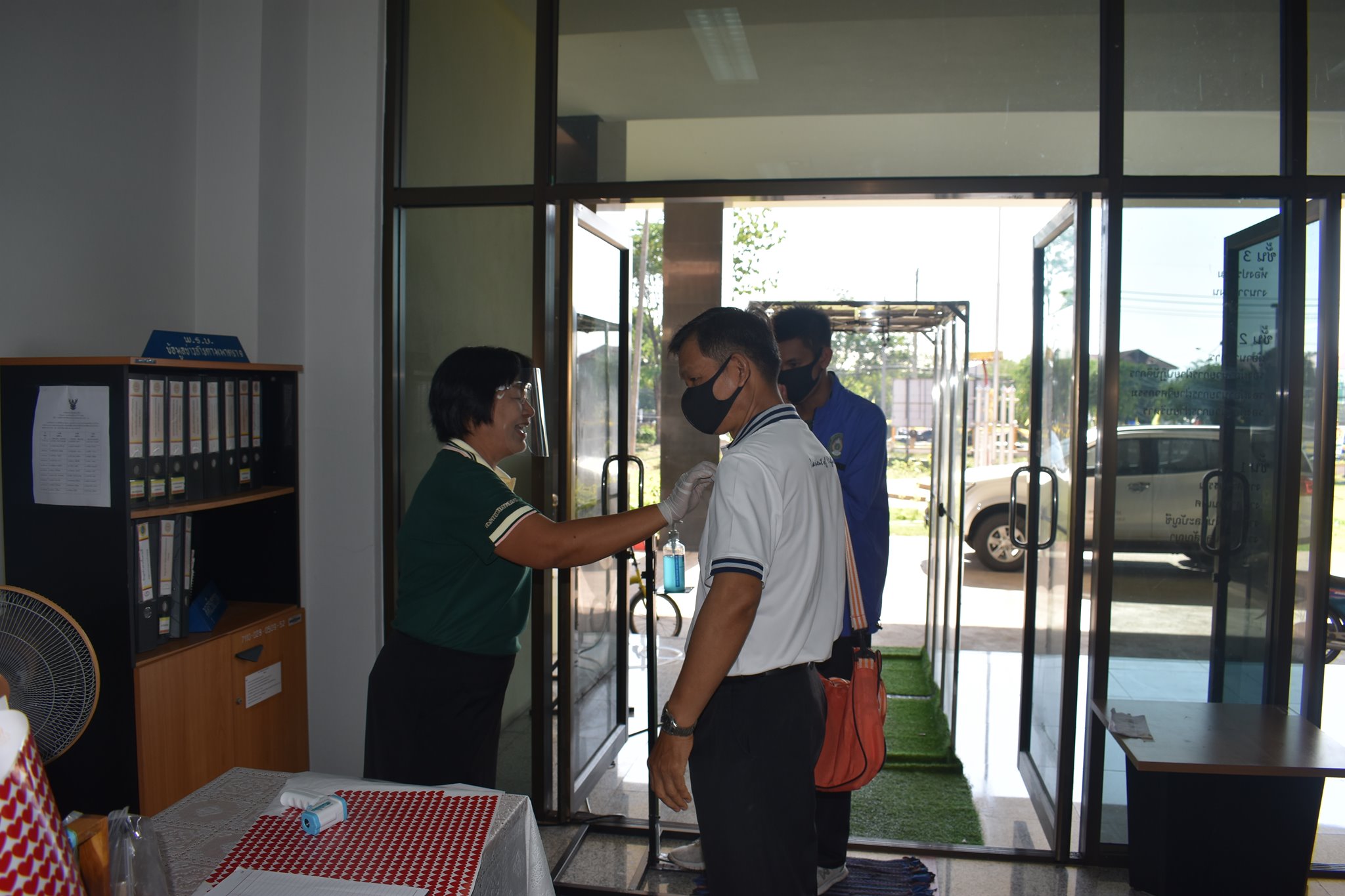 บริเวณทางเข้าด้านหน้าสำนักงาน ตรวจวัดไข้และคัดกรองข้าราชการ เจ้าหน้าที่และประชาชนที่มาติดต่อราชการ เพื่อเฝ้าระวังและป้องกัน