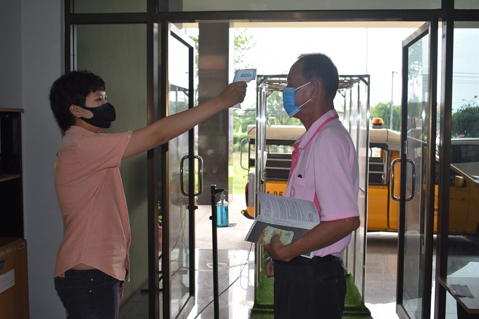 บริเวณทางเข้าด้านหน้าสำนักงาน ตรวจวัดไข้และคัดกรองข้าราชการ เจ้าหน้าที่และประชาชนที่มาติดต่อราชการ เพื่อเฝ้าระวังและป้องกัน