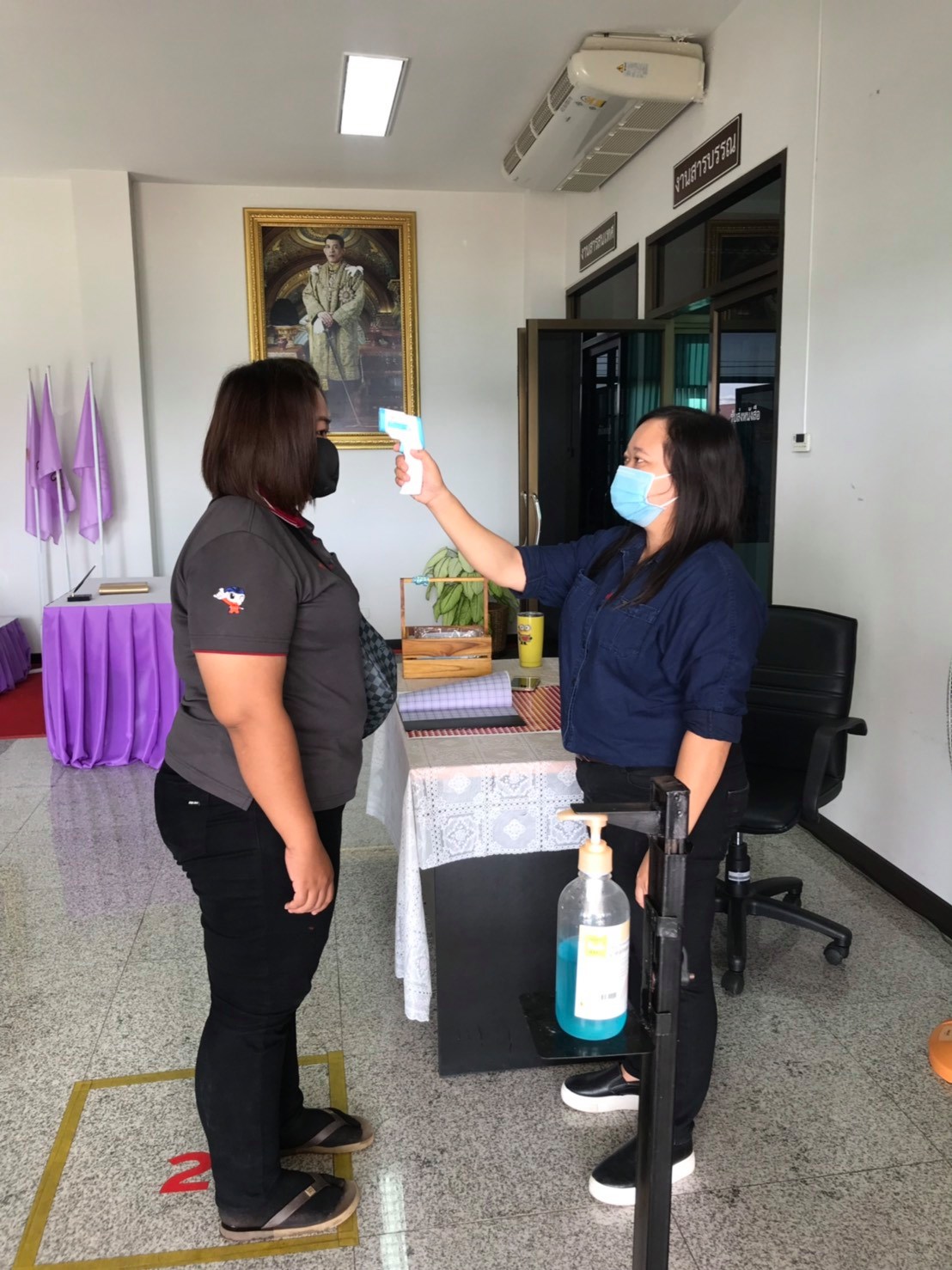 จัดตั้งตู้พ่นน้ำยาฆ่าเชื้อ และจุดคัดกรองด้วยเครื่องวัดอุณหภูมิ บริเวณทางเข้าด้านหน้าสำนักงาน ตรวจวัดไข้และคัดกรองข้าราชการ เจ้าหน้าที่