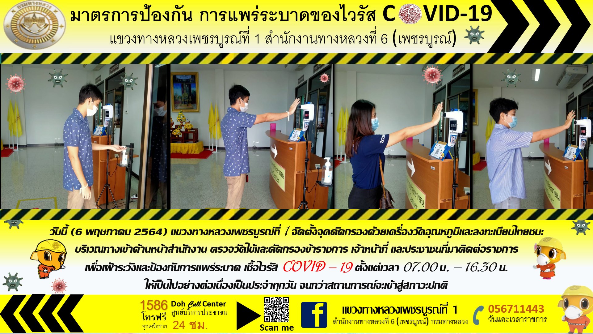 แขวงทางหลวงเพชรบูรณ์ที่ 1 จัดตั้งตู้พ่นน้ำยาฆ่าเชื้อ และจุดคัดกรองด้วยเครื่องวัดอุณหภูมิ วันที่ 6 พฤษภาคม 2564 ตั้งแต่เวลา 07.00 น. – 16.30 น.