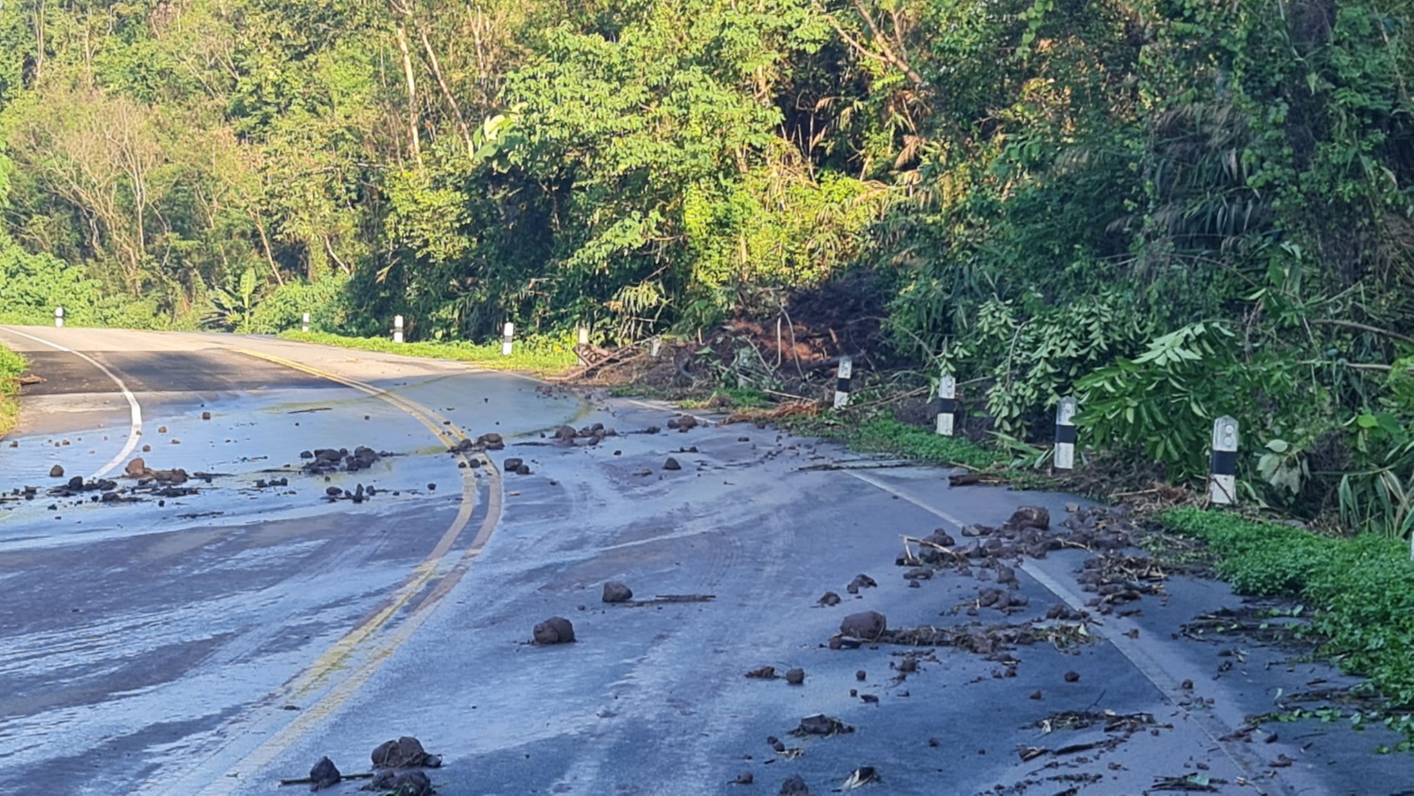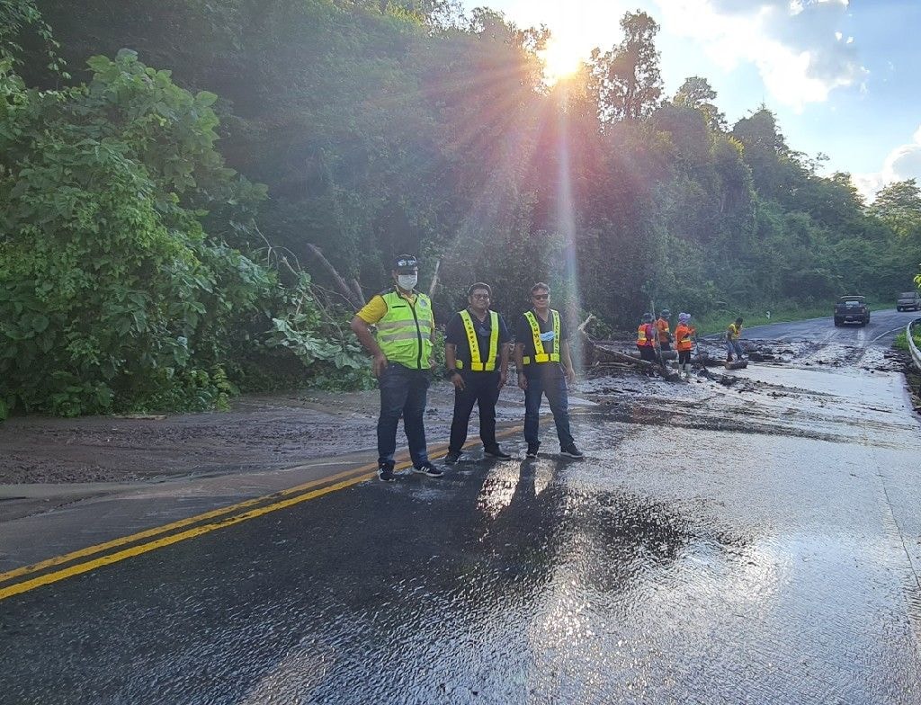 วันนี้ (11 พ.ค. 2564) เวลาประมาณ 16.00 น. เกิดพายุฝนตกหนัก ทำให้ดินสไลด์ปิดทับผิวทางและทางระบายน้ำ และไหล่ทางทรุดตัว ในทางหลวงหมายเลข 2302 ตอน กอไผ่ - บุ่งน้ำเต้า ระหว่าง กม.4+600 - กม 7+800 เป็นช่วงๆ