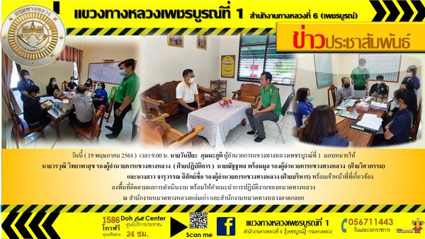 วันนี้ ( 19 พฤษภาคม 2564 ) เวลา 9.00 น. นายวันปิยะ ภุมมะภูติ ผู้อำนวยการแขวงทางหลวงเพชรบูรณ์ที่ 1 มอบหมายให้ นายวรวุฒิ วิทยาพาสุข รองผู้อำนวยการแขวงทางหลวง ( ฝ่ายปฏิบัติการ ) นายณัฐฐพล พร้อมมูล รองผู้อำนวยการแขวงทางหลวง (ฝ่ายวิศวกรรม) และนางสาว จารุวรรณ สีสัตย์ซื่อ รองผู้อำนวยการแขวงทางหลวง (ฝ่ายบริหาร) พร้อมเจ้าหน้าที่ที่เกี่ยวข้อง ลงพื้นที่ติดตามผลการดำเนินงาน พร้อมให้คำแนะนำการปฏิบัติงานของหมวดทางหลวง ณ สำนักงานหมวดทางหลวงหล่มเก่า และสำนักงานหมวดทางหลวงตาดกลอย