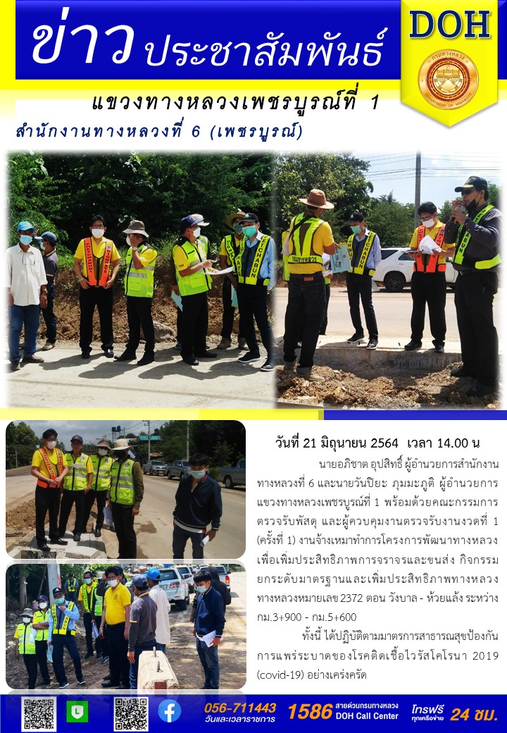 นายอภิชาต อุปสิทธิ์ ผู้อำนวยการสำนักงานทางหลวงที่ 6 และนายวันปิยะ ภุมมะภูติ ผู้อำนวยการแขวงทางหลวงเพชรบูรณ์ที่ 1 พร้อมด้วยคณะกรรมการตรวจรับพัสดุ และผู้ควบคุมงานตรวจรับงานงวดที่ 1 (ครั้งที่ 1) งานจ้างเหมาทำการโครงการพัฒนาทางหลวงเพื่อเพิ่มประสิทธิภาพการจราจรและขนส่ง กิจกรรมยกระดับมาตรฐานและเพิ่มประสิทธิภาพทางหลวง ทางหลวงหมายเลข 2372 ตอน วังบาล - ห้วยแล้ง ระหว่าง กม.3+900 - กม.5+600