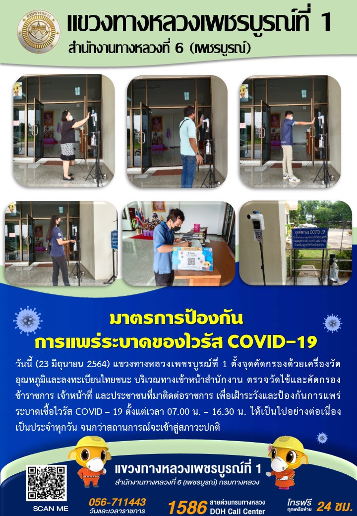 ข้อมูลข่าว : แขวงทางหลวงเพชรบูรณ์ที่ 1 จัดตั้งตู้พ่นน้ำยาฆ่าเชื้อ และจุดคัดกรองด้วยเครื่องวัดอุณหภูมิ วันที่ 23 มิถุนายน 2564 ตั้งแต่เวลา 07.00 น. – 16.30 น.