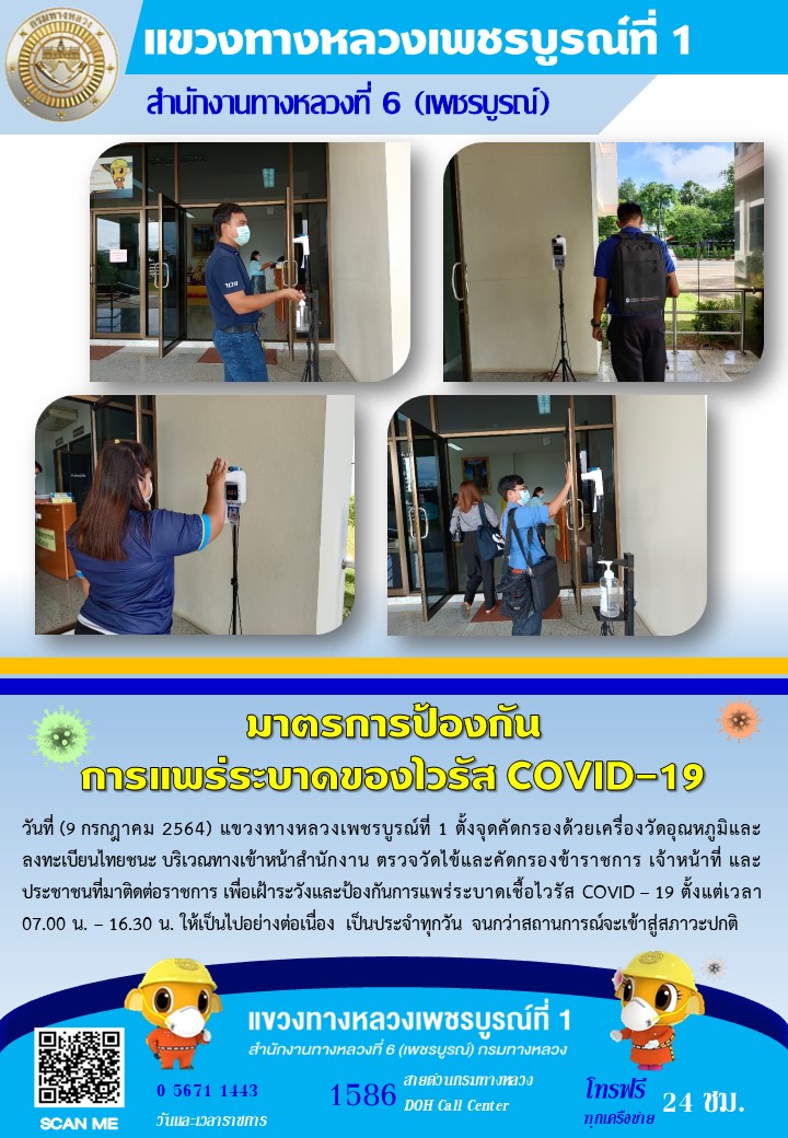 แขวงทางหลวงเพชรบูรณ์ที่ 1 จัดตั้งตู้พ่นน้ำยาฆ่าเชื้อ และจุดคัดกรองด้วยเครื่องวัดอุณหภูมิ วันที่ 9 กรกฎาคม 2564 ตั้งแต่เวลา 07.00 น. – 16.30 น.