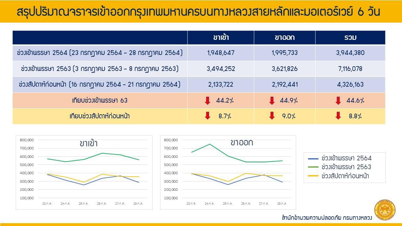 กรมทางหลวง สรุปจำนวนปริมาณจราจรเข้า-ออกกรุงเทพฯ บนทางหลวงสายหลัก และมอเตอร์เวย์ จำนวน 10 เส้นทาง ในช่วงวันหยุดต่อเนื่องวันอาสาฬหบูชาและวันเข้าพรรษาในระหว่างวันที่ 23 - 28 ก.ค. 64 พบยอดการเดินทางลดลงกว่า 3.2 ล้านคัน เมื่อเทียบกับปีที่ผ่านมา